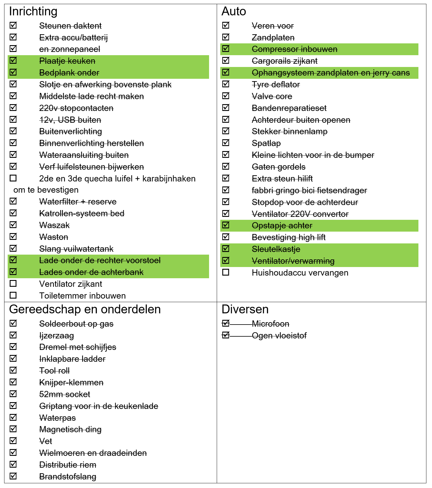 Tijdens onze eerste deel wereldreis (naar Marokko) hebben wij een kluslijst bijgehouden van verbeteringen aan de auto en uitrusting.