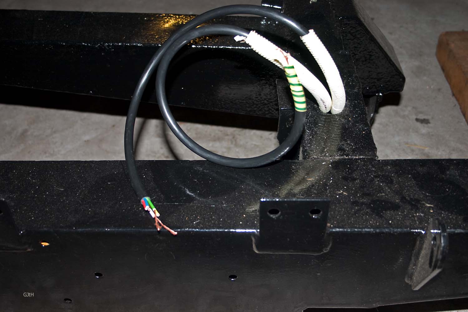 De kabelboom bestaat uit twee meeraderige aanhangwagenkabels die ik door flexibele pvc-elektrapijp in het chassis heb geschoven.