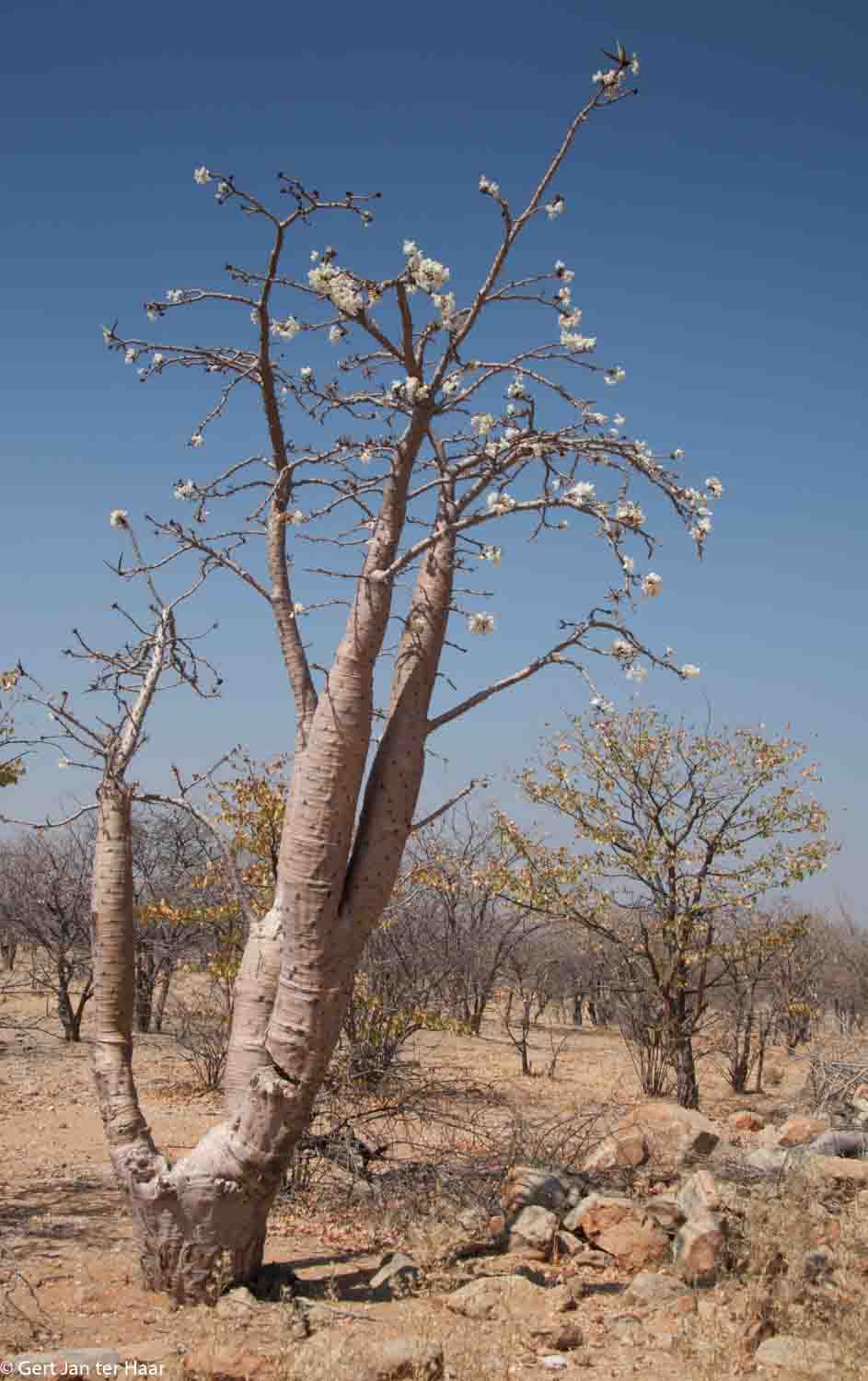 Deze boom zag ik al onderweg van Opuwo naar Epupa, maar toen had ik vooral mijn aandacht nodig voor Milady (zie Mysteries van een Oude Dame). Op de terugweg viel me gelukkig de boom weer op, een bloeiende baobab, prachtig!