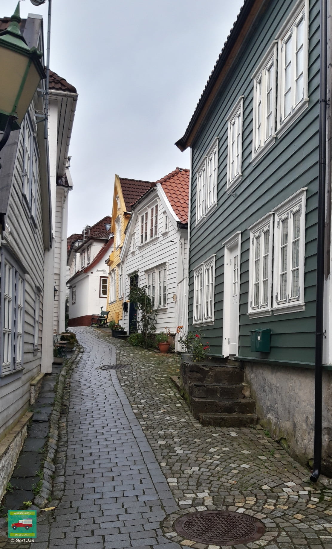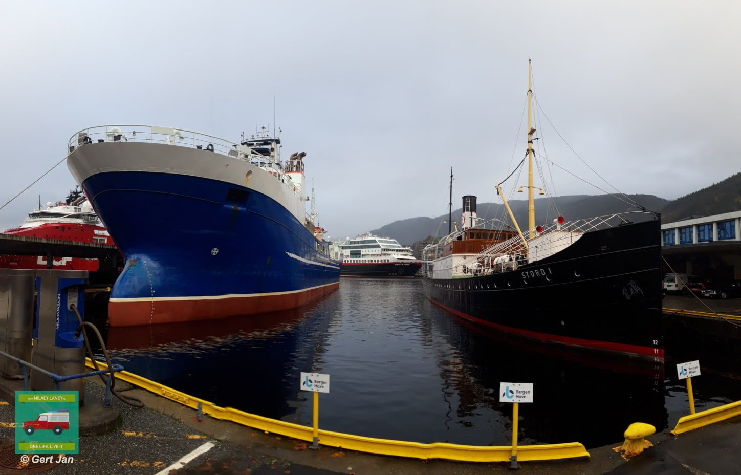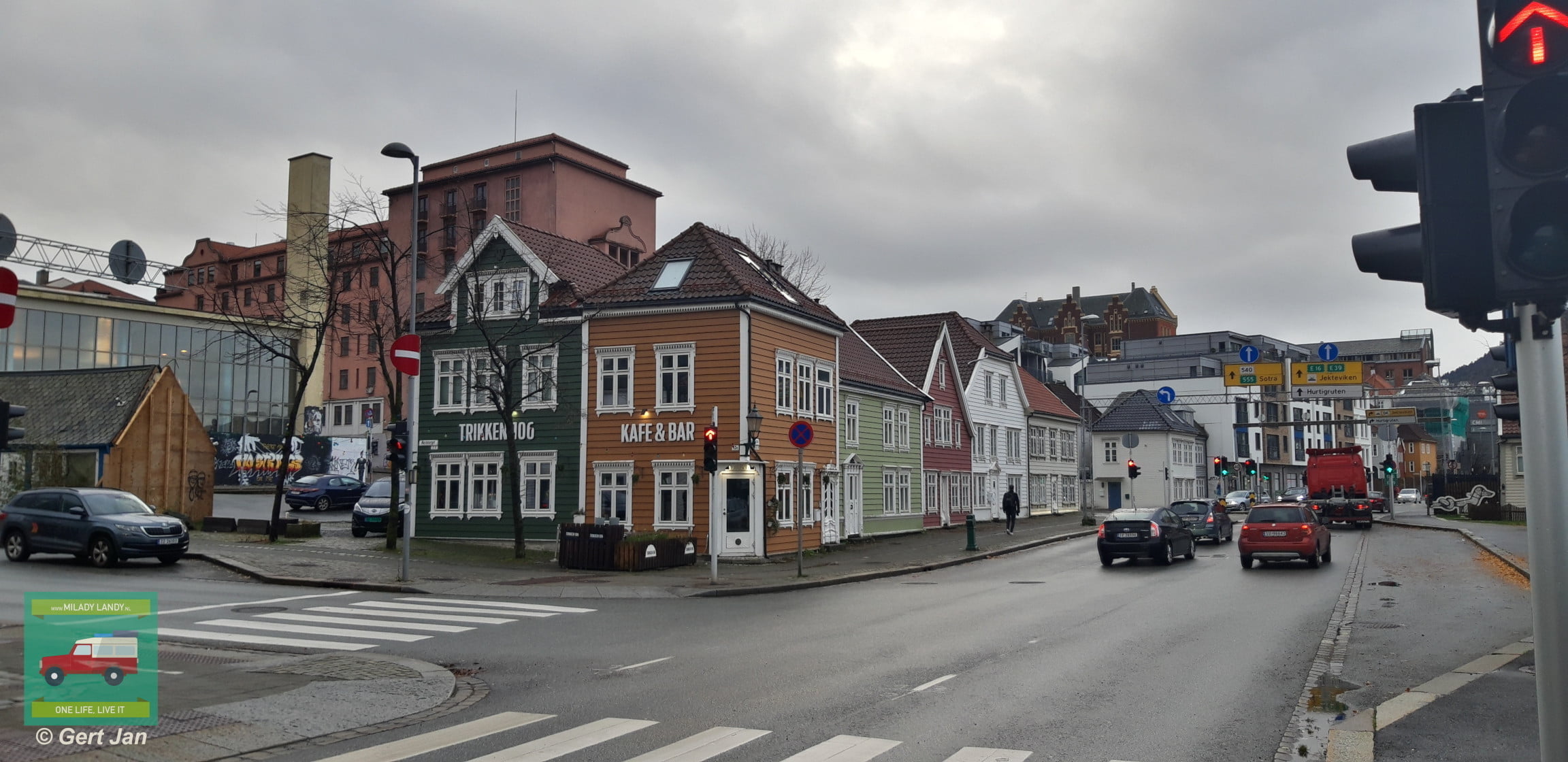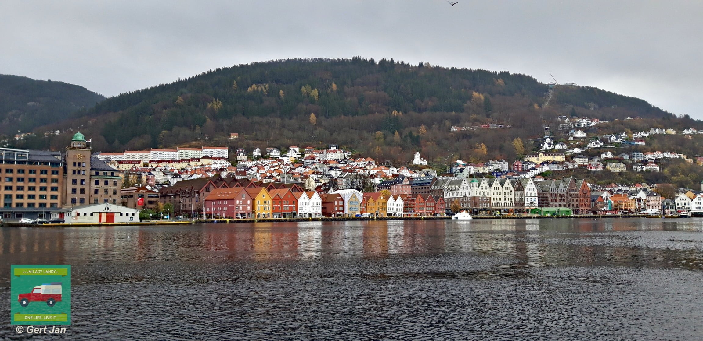 De stad verwelkomt ons met redelijk droog weer, een enkel miezerbuitje trekt over. Bergen heeft de naam dat het er altijd regent, dus we hebben geluk.