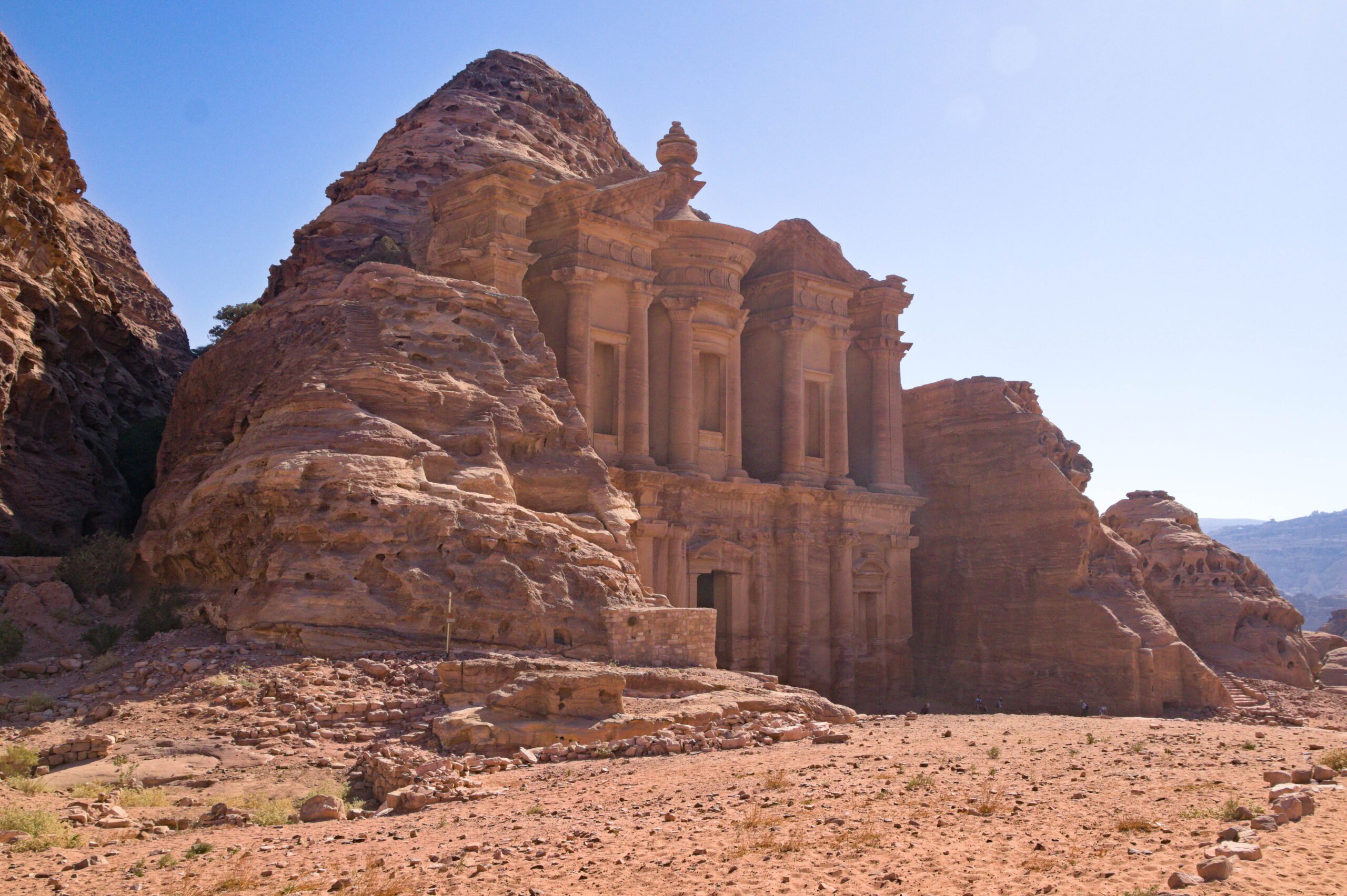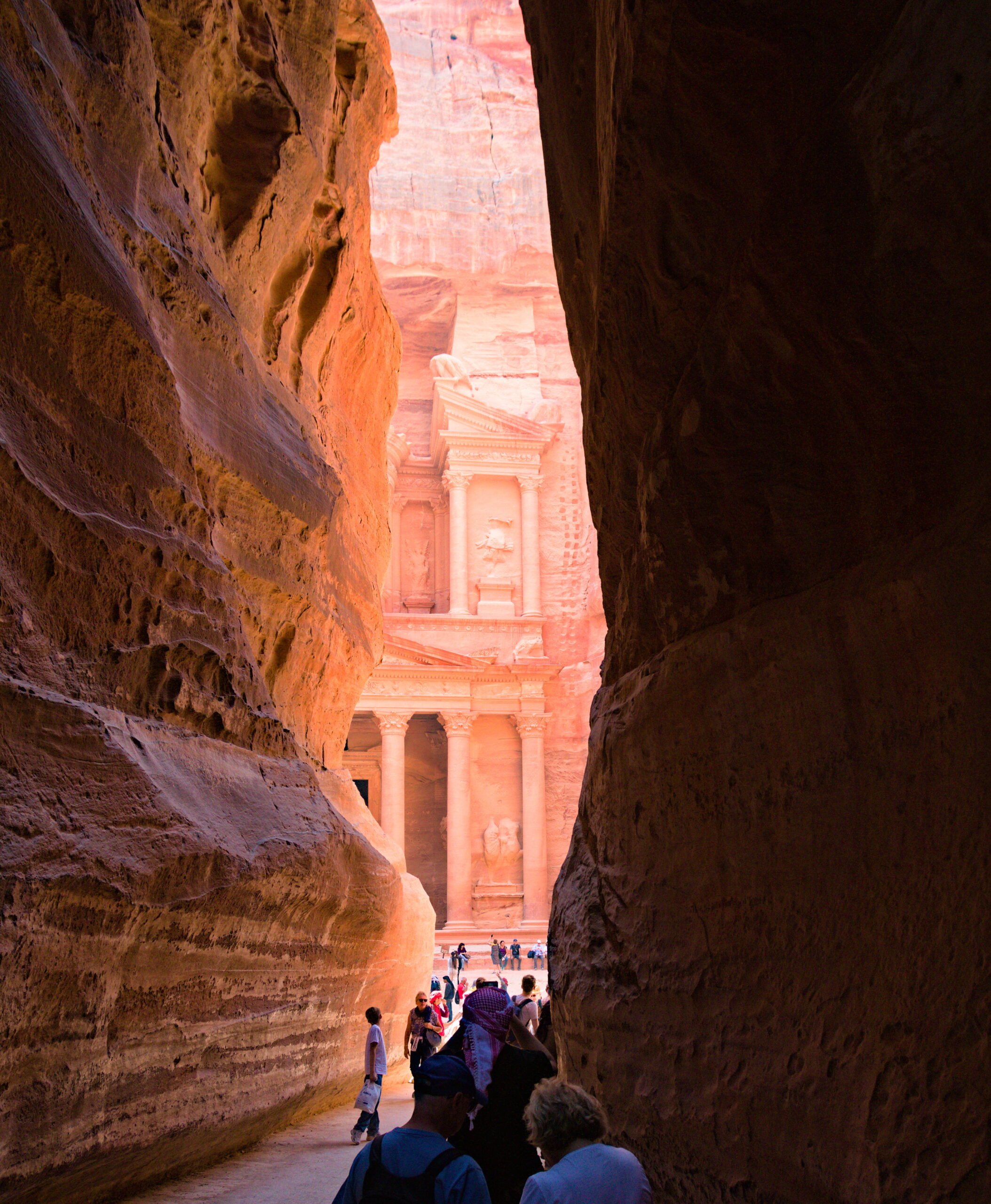 De toegang naar de Petra-site leidt door een lange kloof. Aan het eind daarvan ligt de Treasury, een prachtig, uit de rotsen gehouwen, bouwwerk.