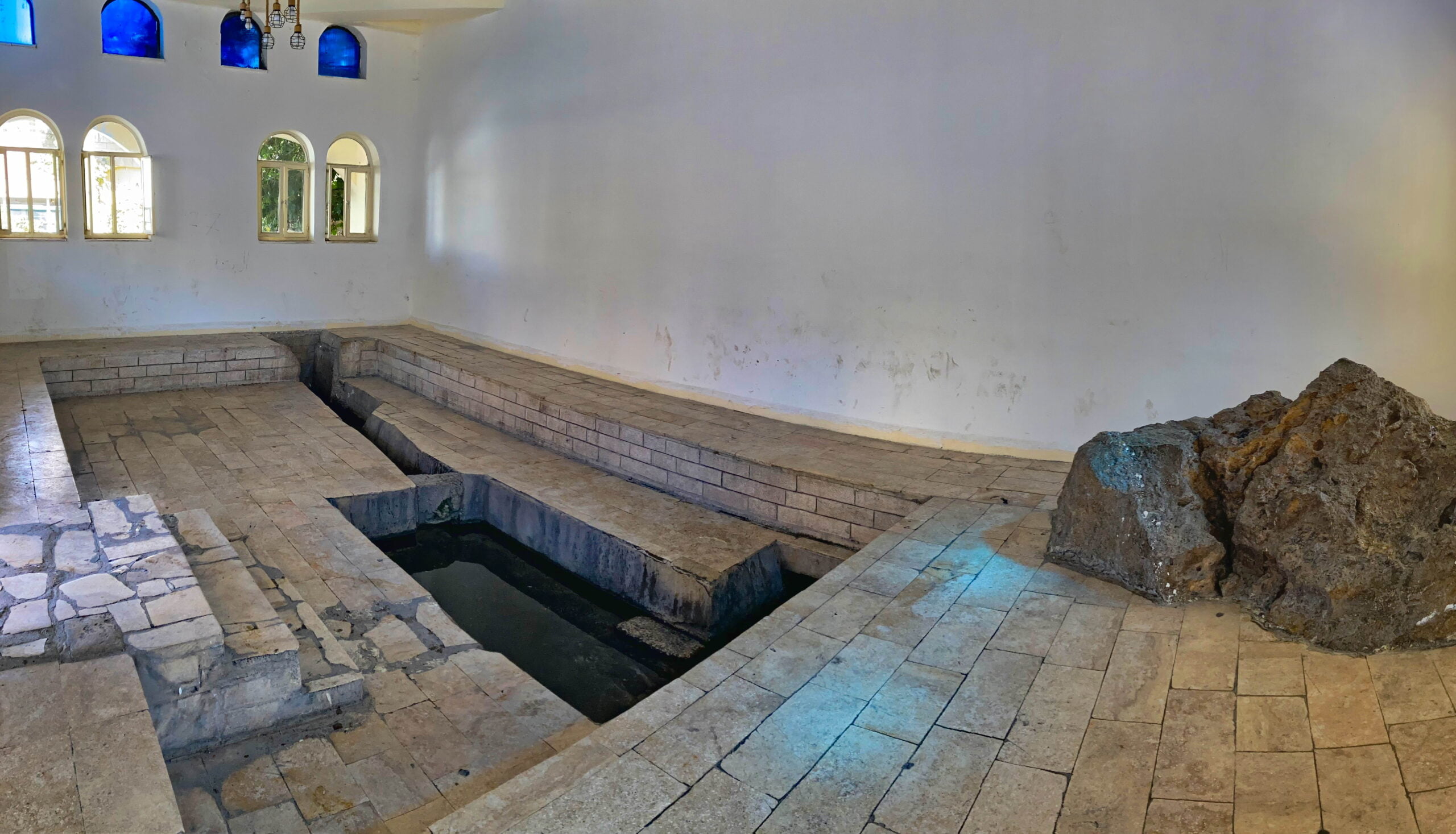 Wij lopen over deze gedenkplaats en bewonderen de bouwwerken en monumenten die in de loop van de eeuwen hier zijn verrezen. In de verte hebben we zicht op de Jordaan en Palestina/Israël.