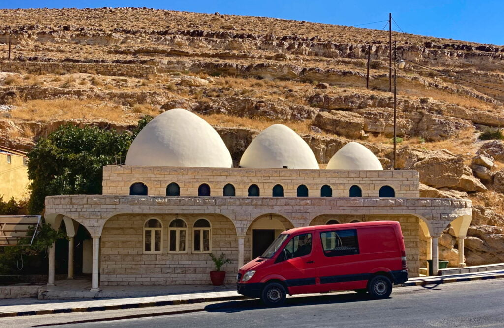 In Madaba kunnen we overnachten op de parkeerplaats van het Madaba Visitor Centre. Saba, de medewerkster van het Visitor Centre die ons ontvangt, regelt dit met de plaatselijke politie en de bewaking van de parkeerplaats. We kunnen na 18:30 onze auto op de parkeerplaats zetten en moeten vóór 8:30 de volgende ochtend vertrekken.