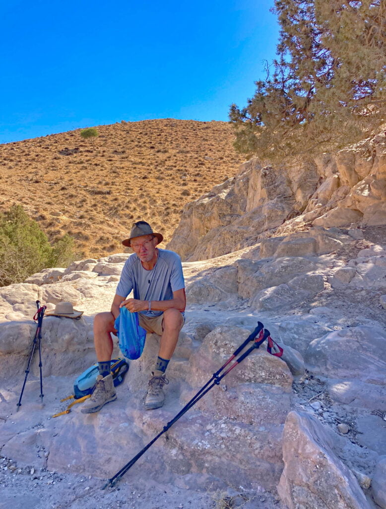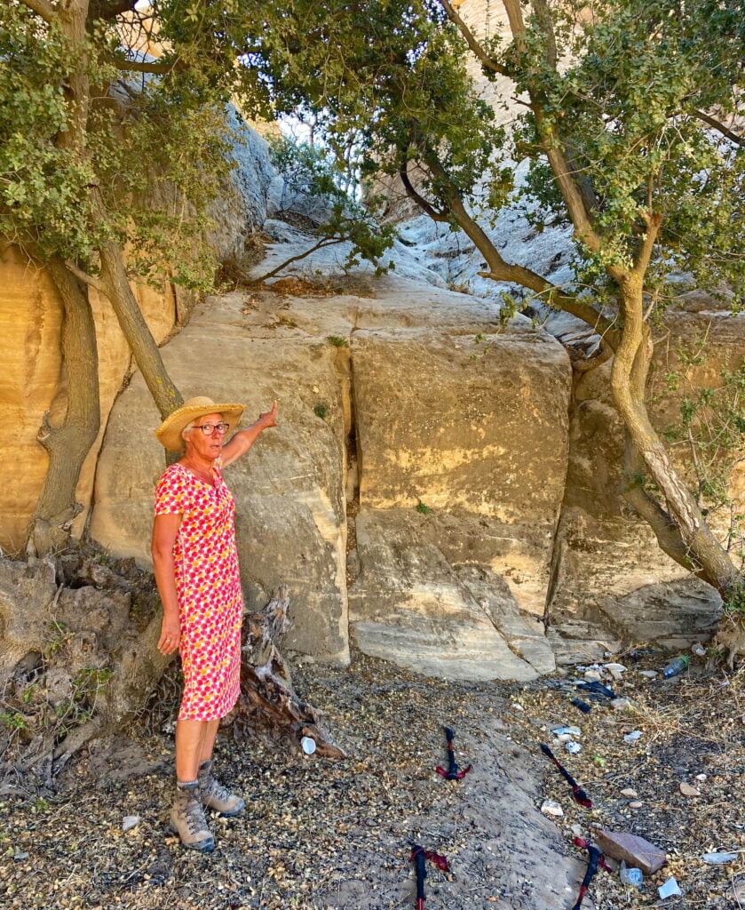 We staan aan de rand van een droge vallei, een wadi, die in de winter verandert in een groene oase. Na een heerlijk rustige nacht besluiten we een wandeling te maken in de vallei. Met de app Komoot op de telefoon vinden we onze weg via een “pad”. Dat pad blijkt iets minder makkelijk te vinden dan gedacht. We doen zo’n 5 uur over de rondwandeling met flinke klauterpartijen van ruim 9 km.