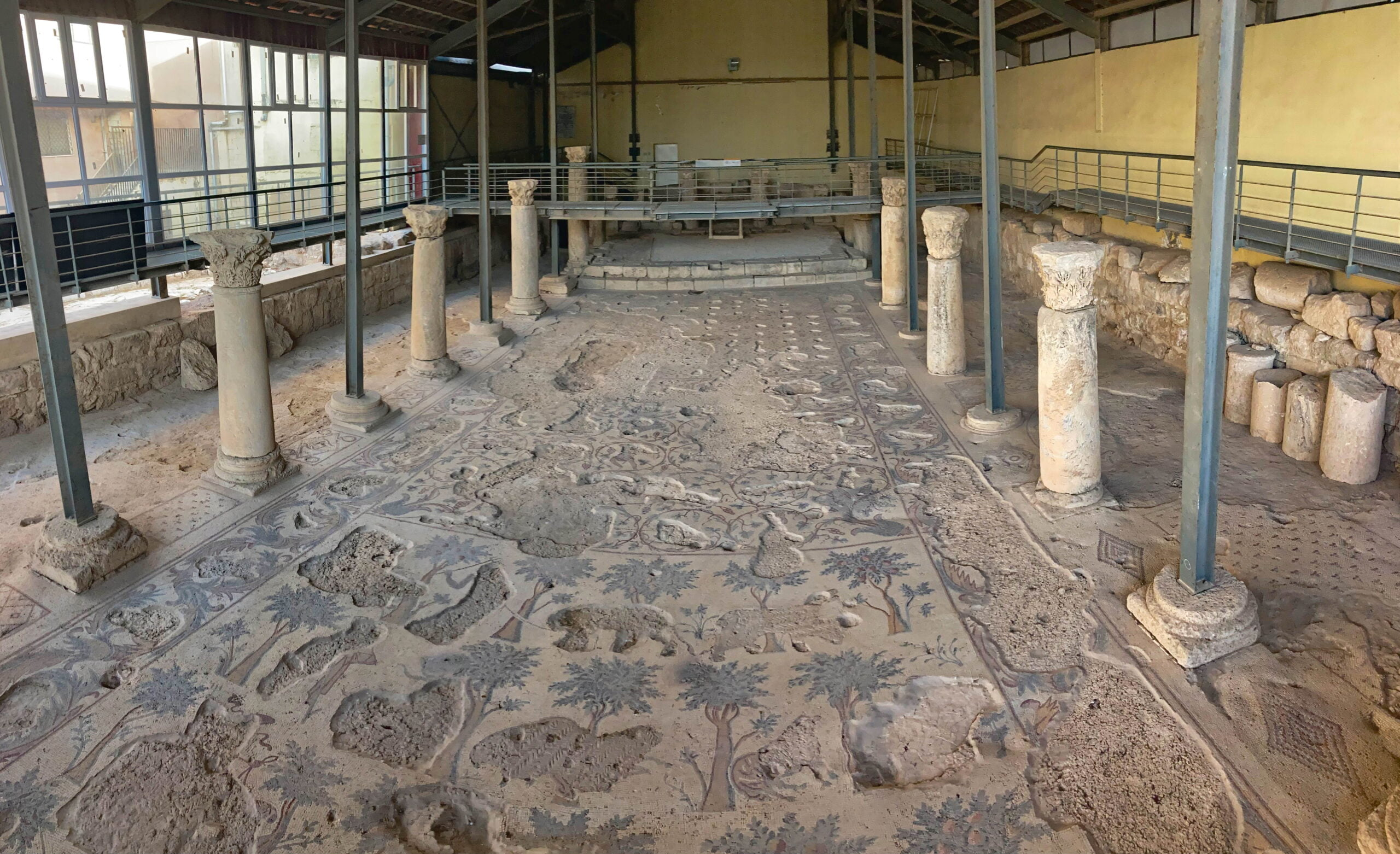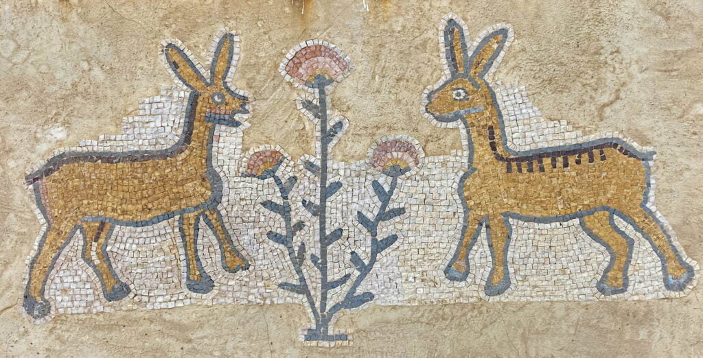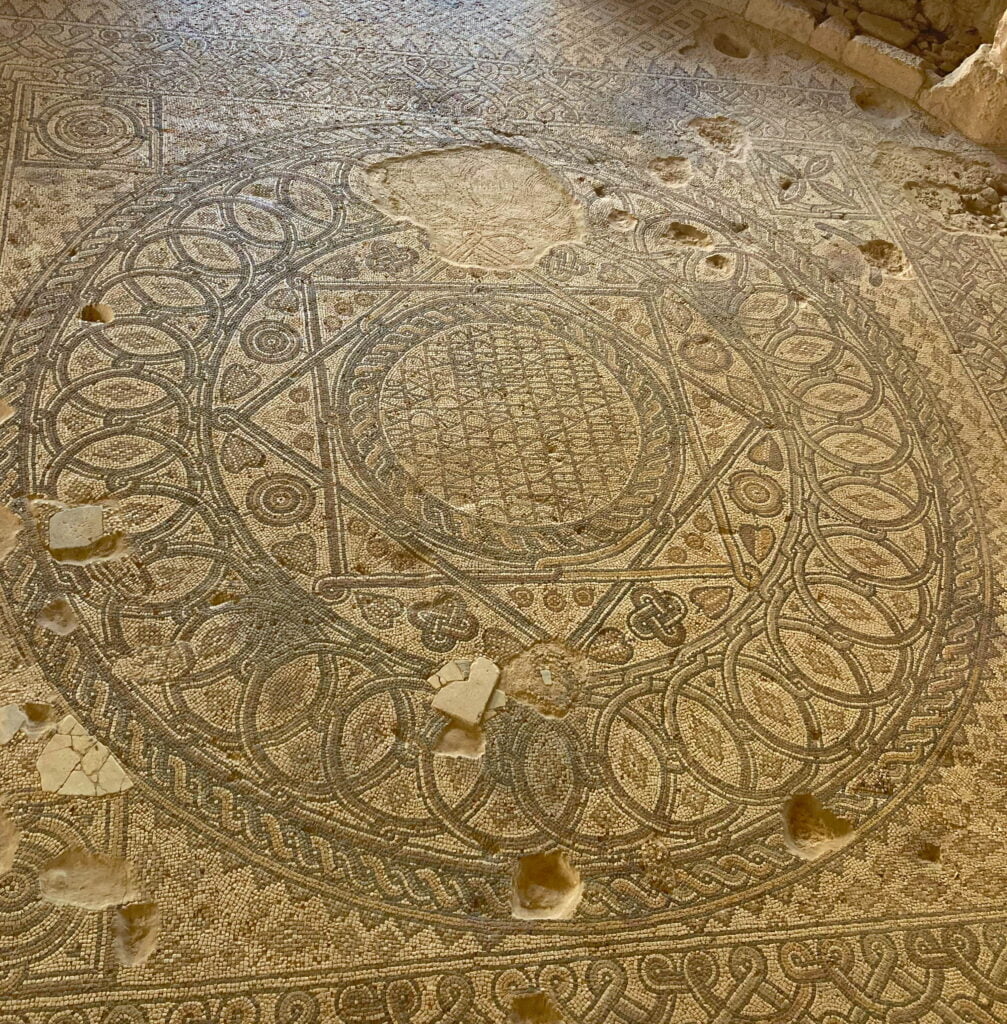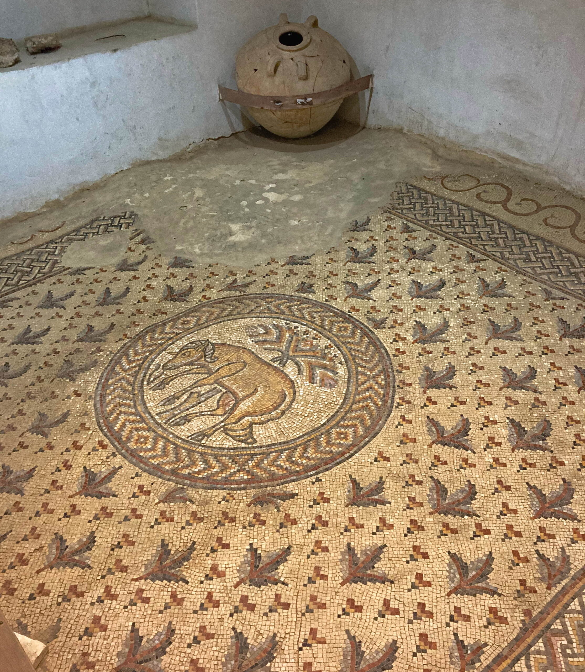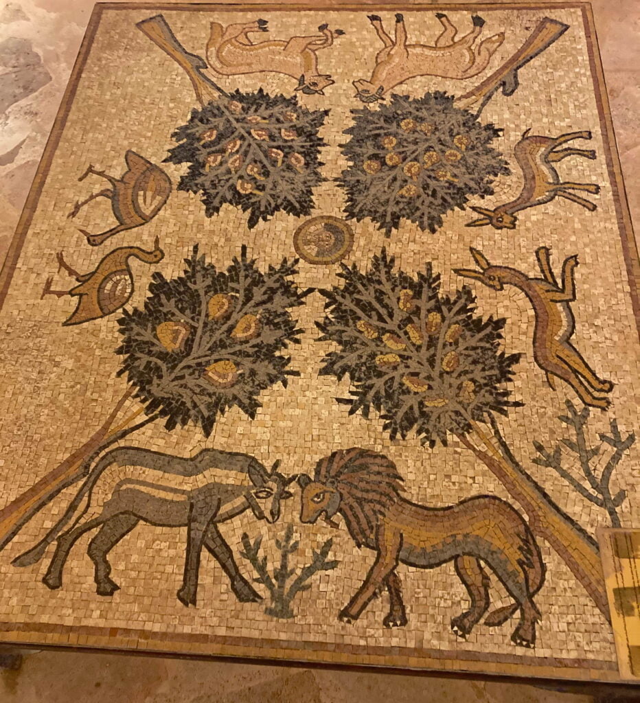 Op weg naar de berg Nebo bezoeken we nog een mozaïek workshop waar we door de aanwezige jonge vrouwen worden gewezen op de kerk van St. Lot & Procopius. Hier is een prachtig mozaïek aanwezig. Gelukkig is de deur van de ruimte open, dat gaat op afspraak en net voor ons arriveert een bus met toeristen.