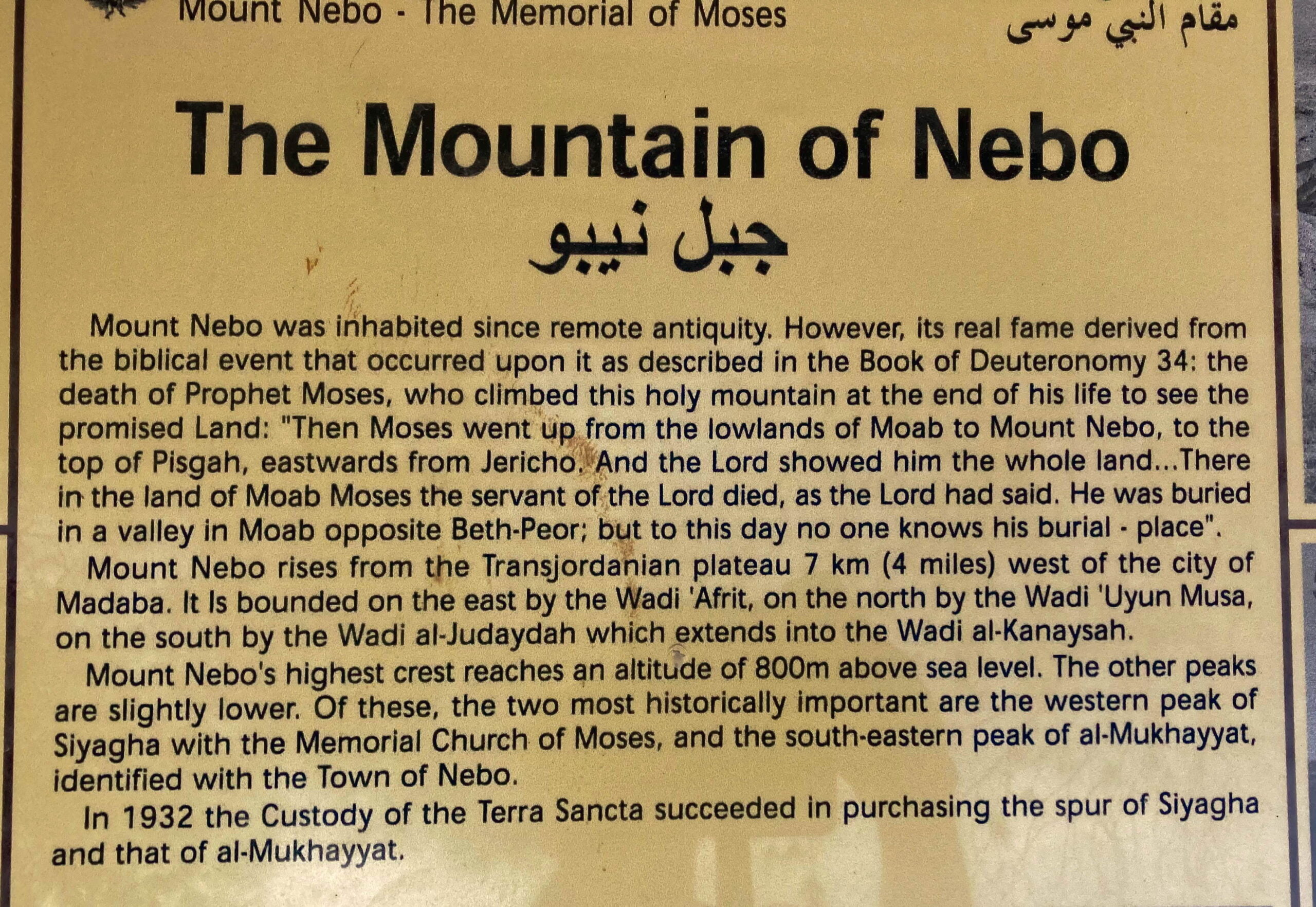 Voor Moslims, Christenen en Joden is Mount Nebo een bijzondere gedenkplaats. De profeet Moses ging deze berg op aan het eind van zijn leven en stierf hier met het zicht op het beloofde land van Kanaän.