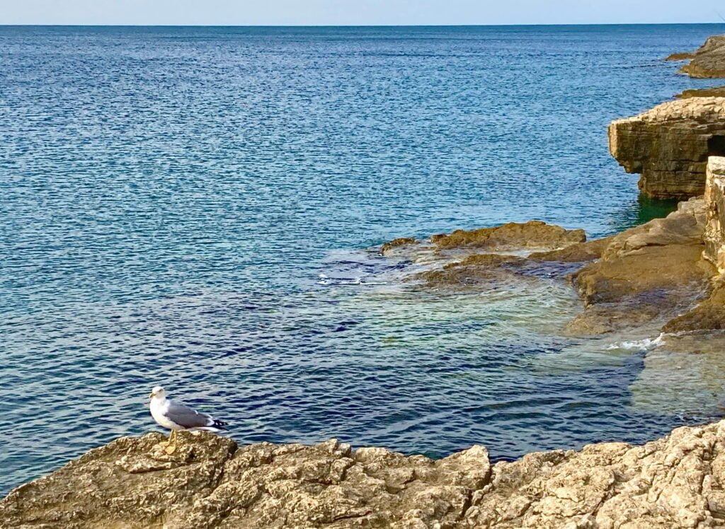 Vanuit Piran in Slovenië rijden we verder naar het zuiden langs de Adriatische kust, de grens van Kroatië over. Een EU-grensovergang, er zijn dus geen formaliteiten.