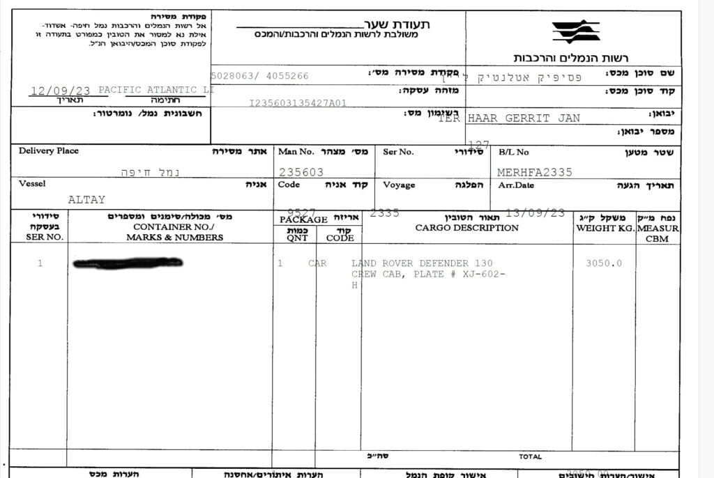 De totale kosten voor het verschepen van Milady Landy – een Defender 130 met een totale lengte van 5,30m; breedte=1,90m hoogte=2,62m – zijn: