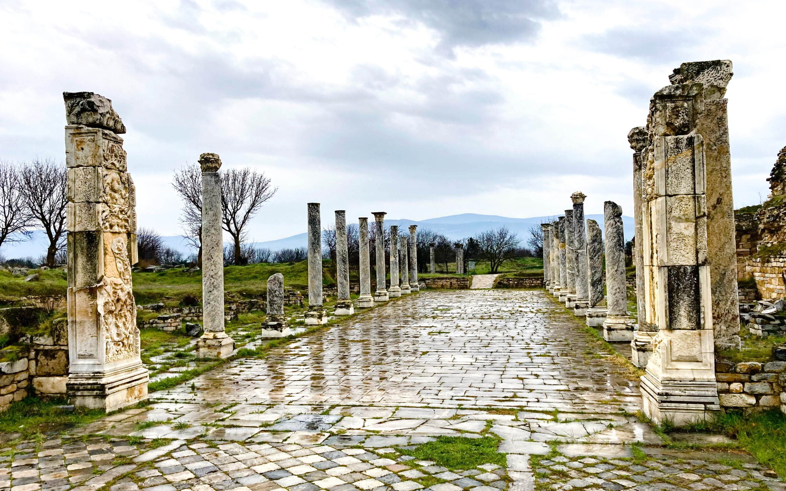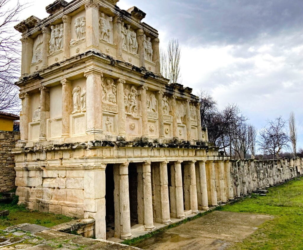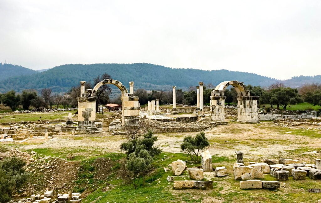 Bij de antieke stad Afrodisias kunnen we op de parkeerplaats staan om te overnachten. Het miezert een beetje als we aankomen, maar we besluiten toch de archeologische vindplaats te gaan verkennen. Er is amper iemand te bekennen, wat het voor ons nog avontuurlijker maakt, we kunnen rustig rondlopen en de historie van deze oude stenen tot ons door laten dringen.