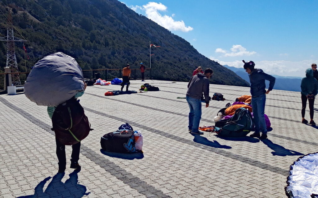 Gestimuleerd door de verhalen van zoon Rindert, vriendin Ciel en broer Bart, besluit ik, Gert Jan, te gaan paragliden. Om 11 uur ’s ochtends word ik opgehaald bij de camping door m’n piloot/instructeur. We rijden naar de kabelbaan die ons tot 1.700 meter hoog de berg Babadağ op neemt, met de nodige uitrusting voor de duovlucht.