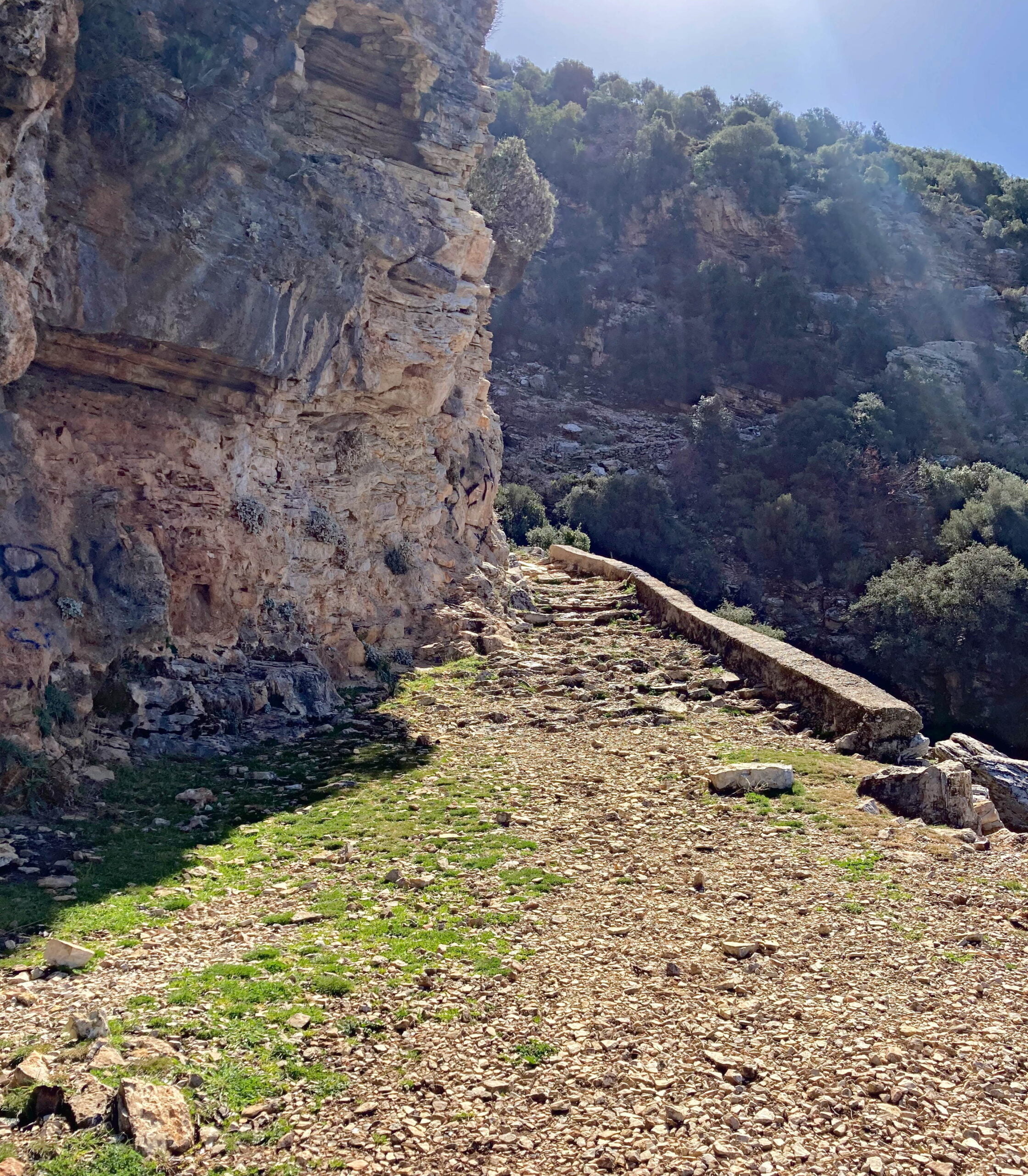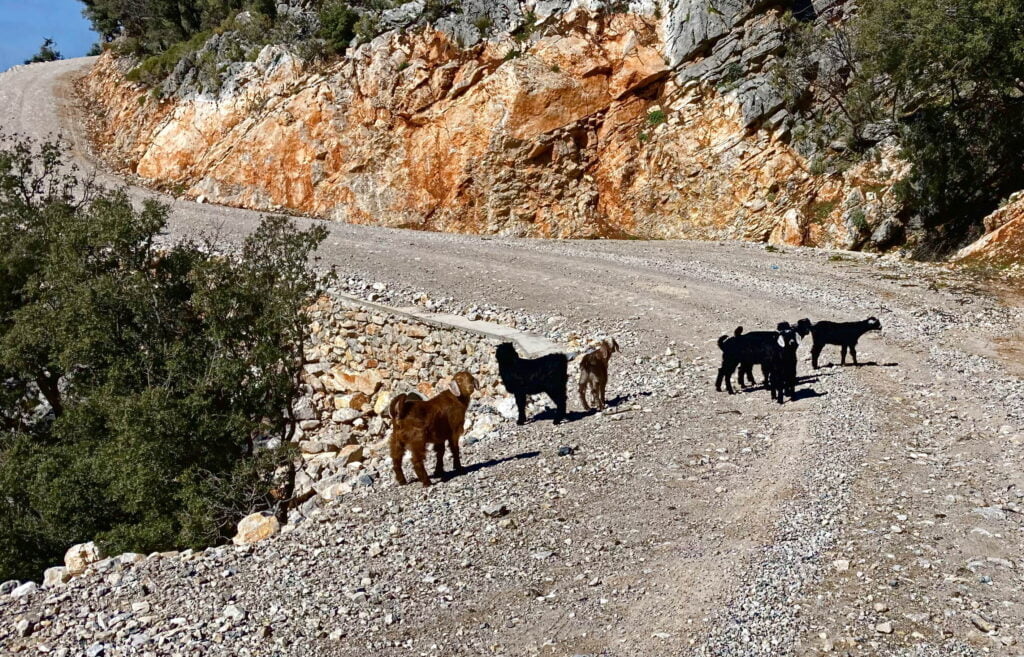 Gelukkig komt later de zon door de wolken en kunnen we vanuit Tlos over kleine wegen richting de Saklikent kloof en watervallen rijden. Onze OSMAnd GPS wijst ons een onverharde weg door het bos. De paden zijn glibberig en ik moet goed sturen om Milady op het rechte pad te houden. Plots zie ik in m’n achteruitkijkspiegel dat we een stuk plastic meeslepen…