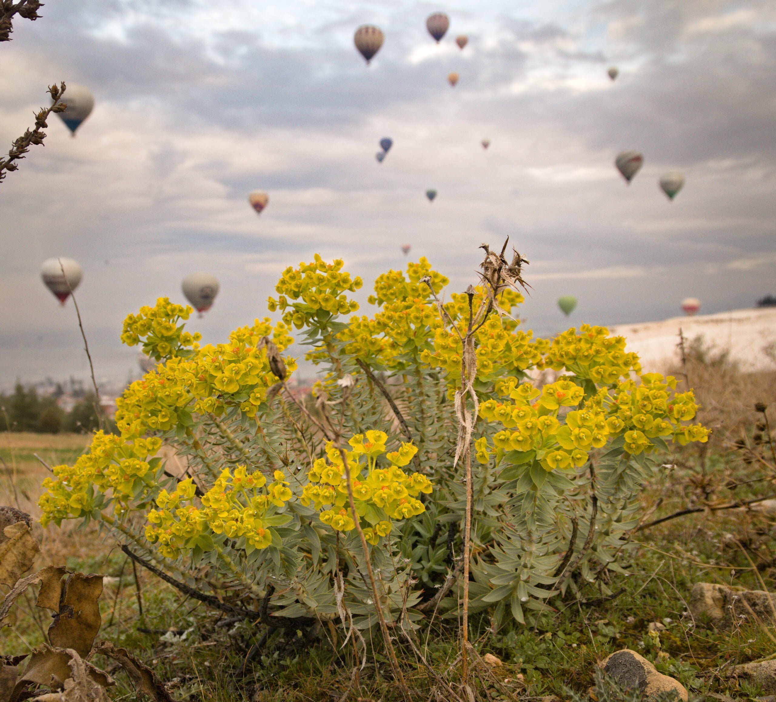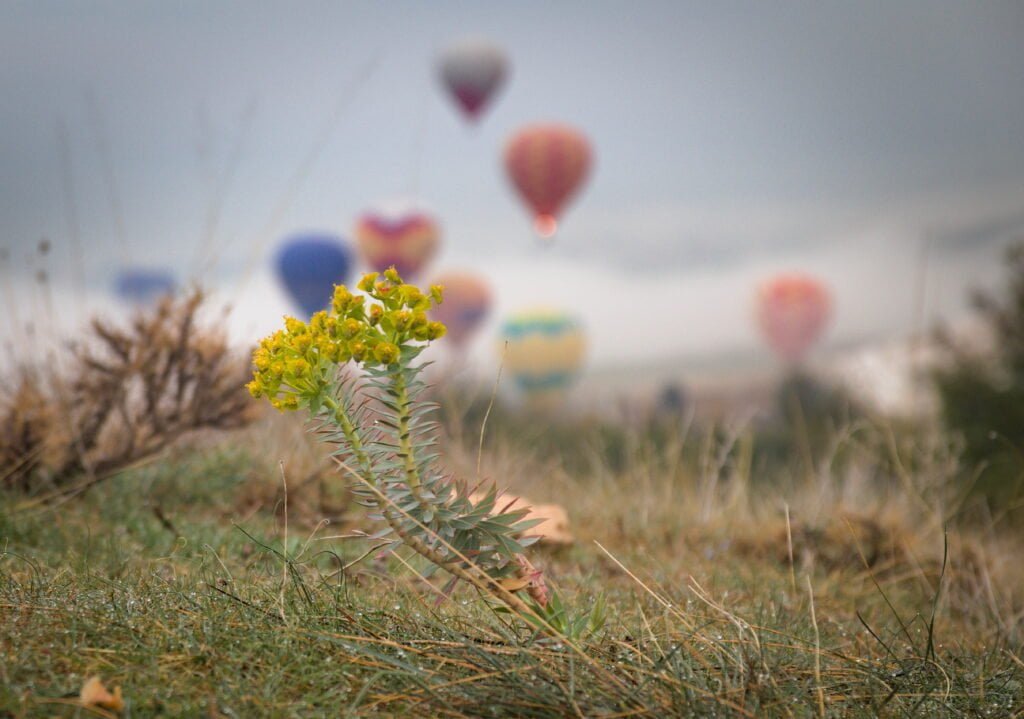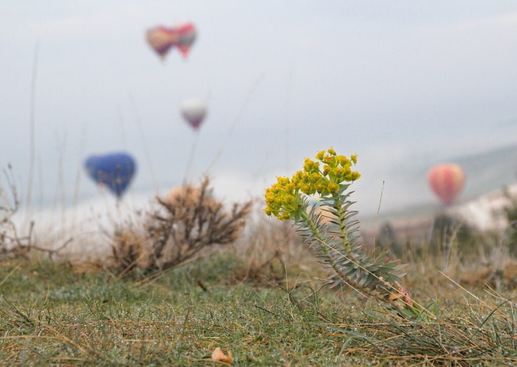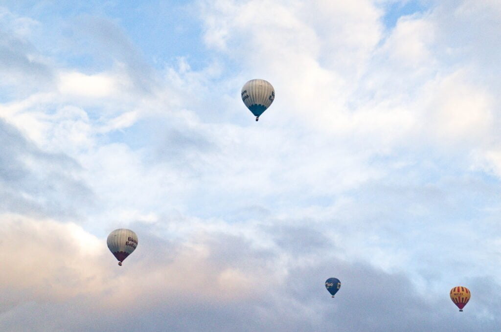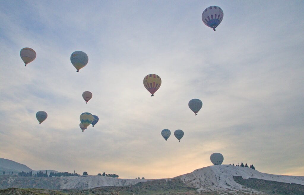 ’s Ochtends worden we wakker op een plekje met uitzicht op de kalkrotsen. Vlakbij ons worden hete luchtballonnen opgelaten, een betoverend gezicht bij het ochtendlicht.