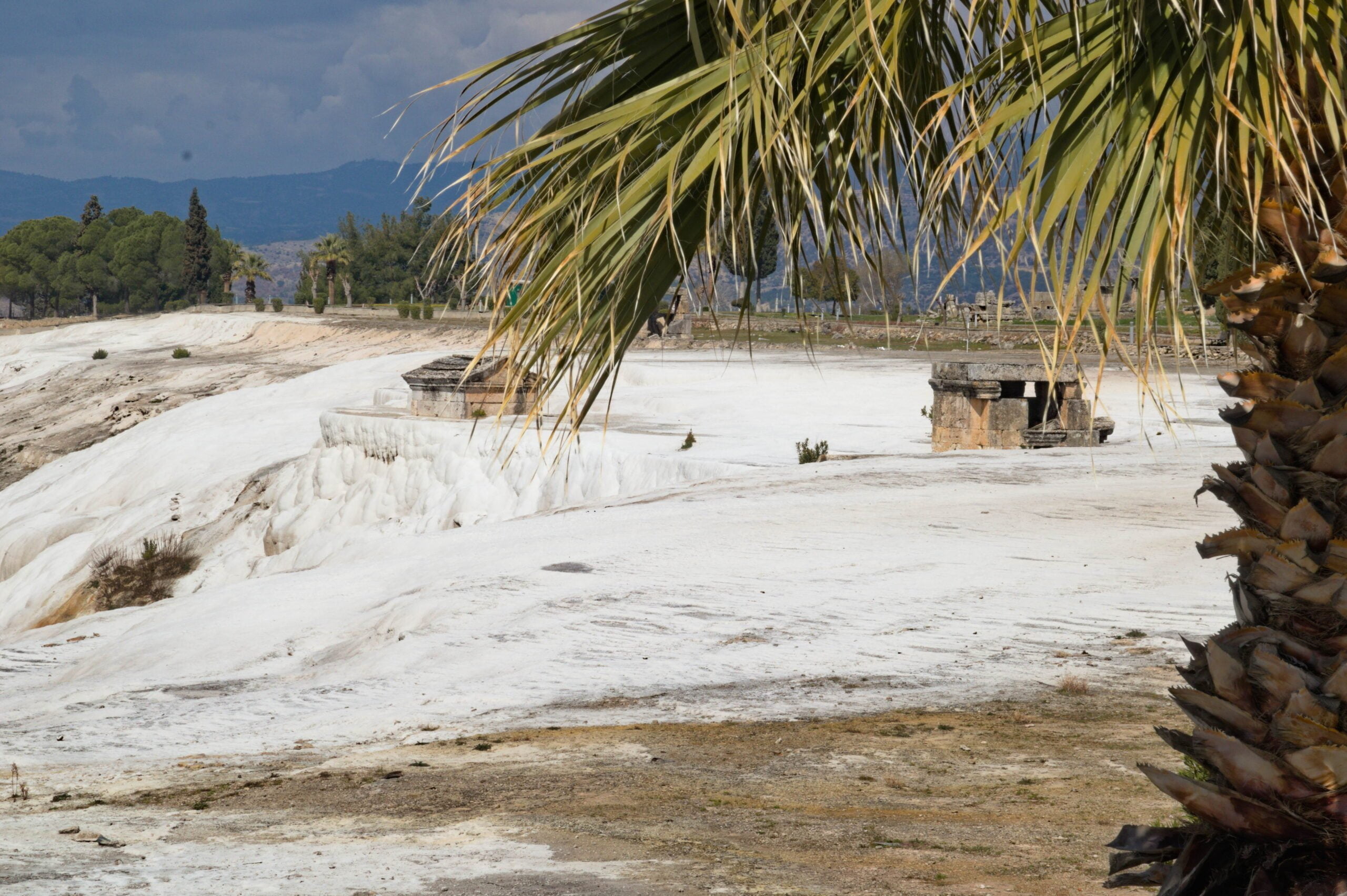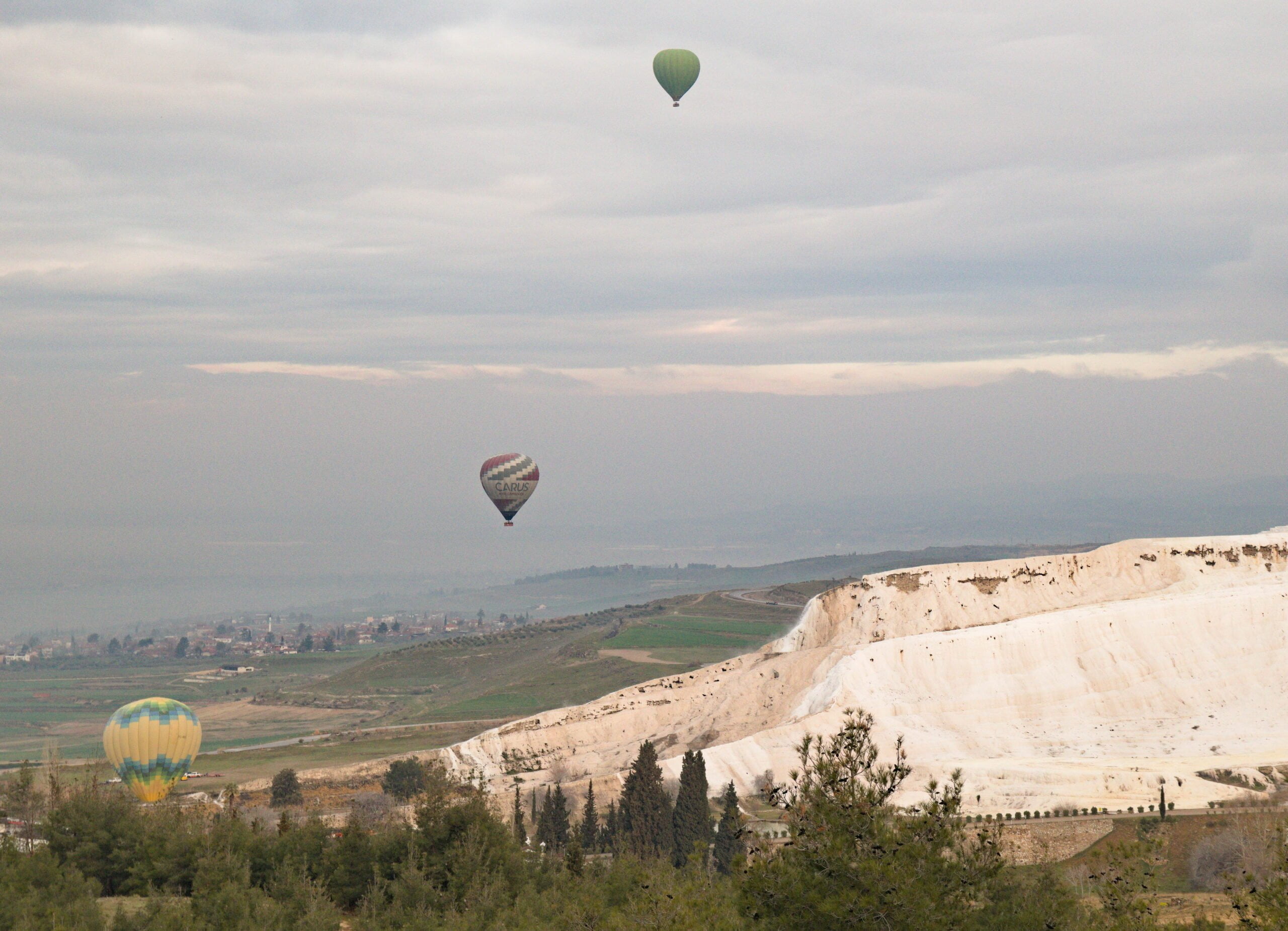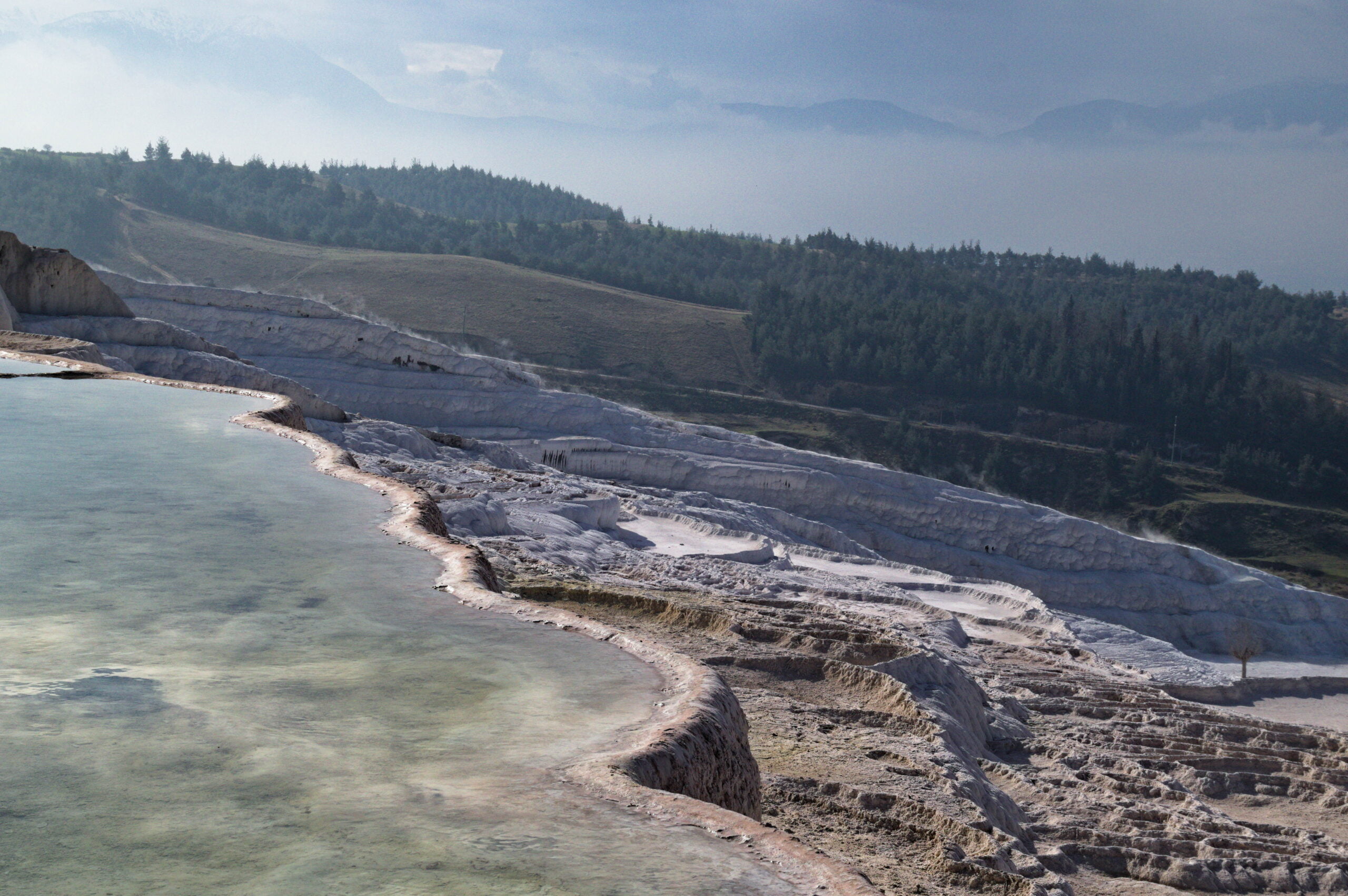 Van ver zien we de krijtrotsen van Pamukkale. Eerst lijkt het op de zoveelste marmergroeve, maar als we dichterbij komen zien we de krijtafzettingen die zich in vele millennia hebben gevormd op de hellingen onder de stad Hiërapolis.