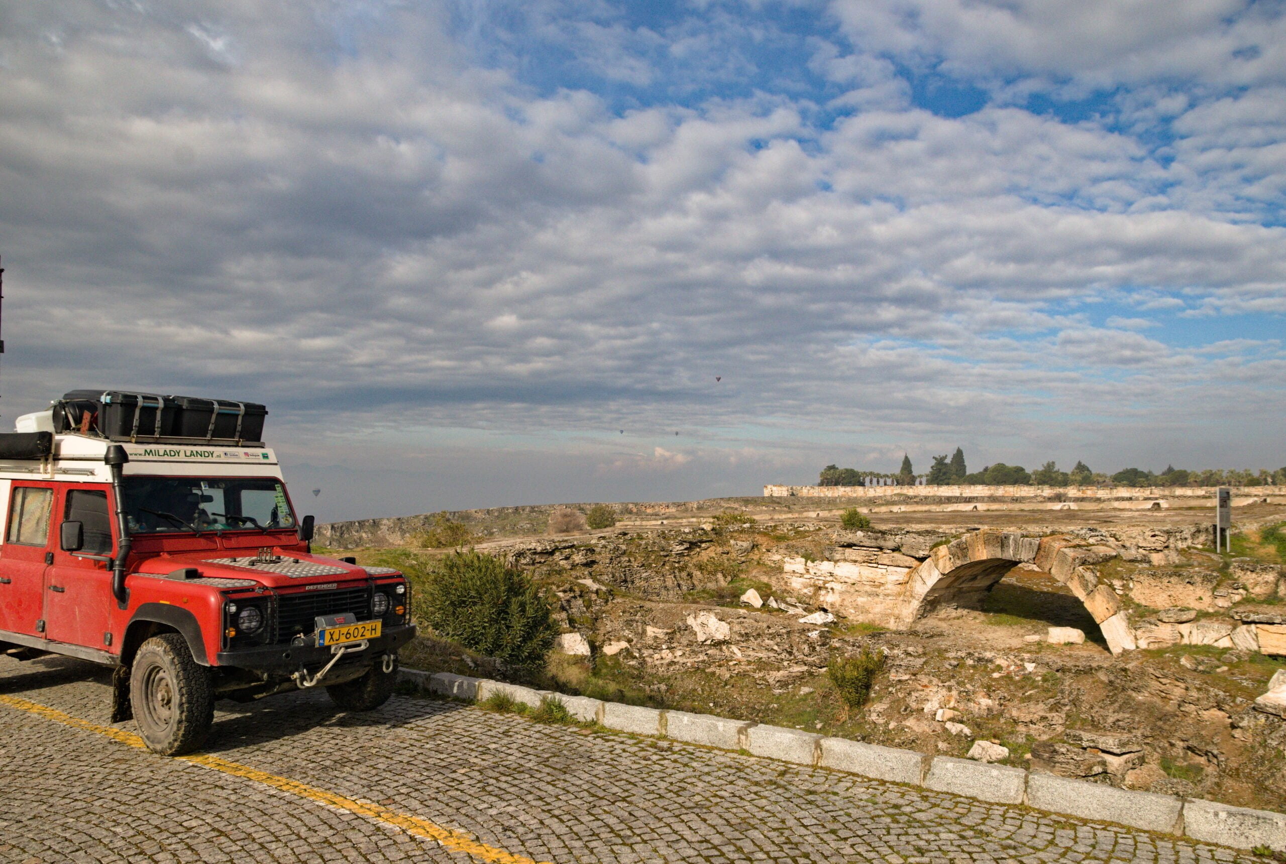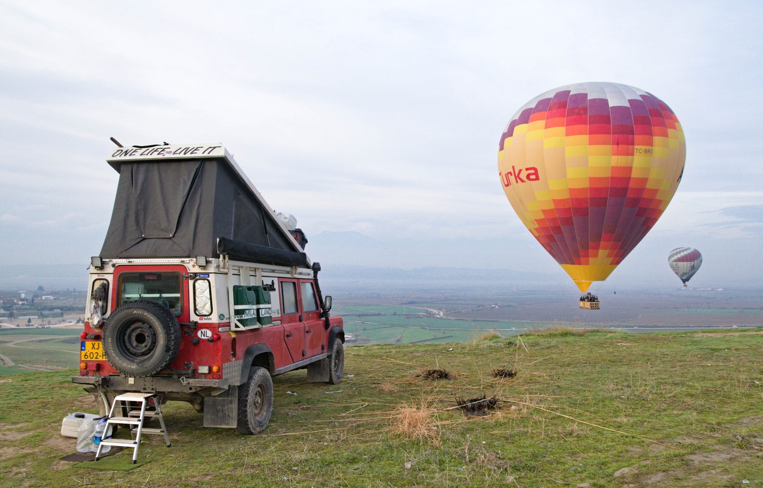 Bij de opgraving van Tlos hebben we een overnachtingsplekje gevonden, een klein weitje waar we net op kunnen staan met onze Milady Landy. Later krijg ik een berichtje van Vincent. Hij en Kirsten staan op een veldje vlakbij en ze nodigen ons uit voor het ontbijt. Na een rustige en regenachtige, nacht zoeken we de Unimog op en kletsen we gezellig bij met Vincent en Kirsten. Behalve het reizen hebben we veel onderwerpen voor gesprek.