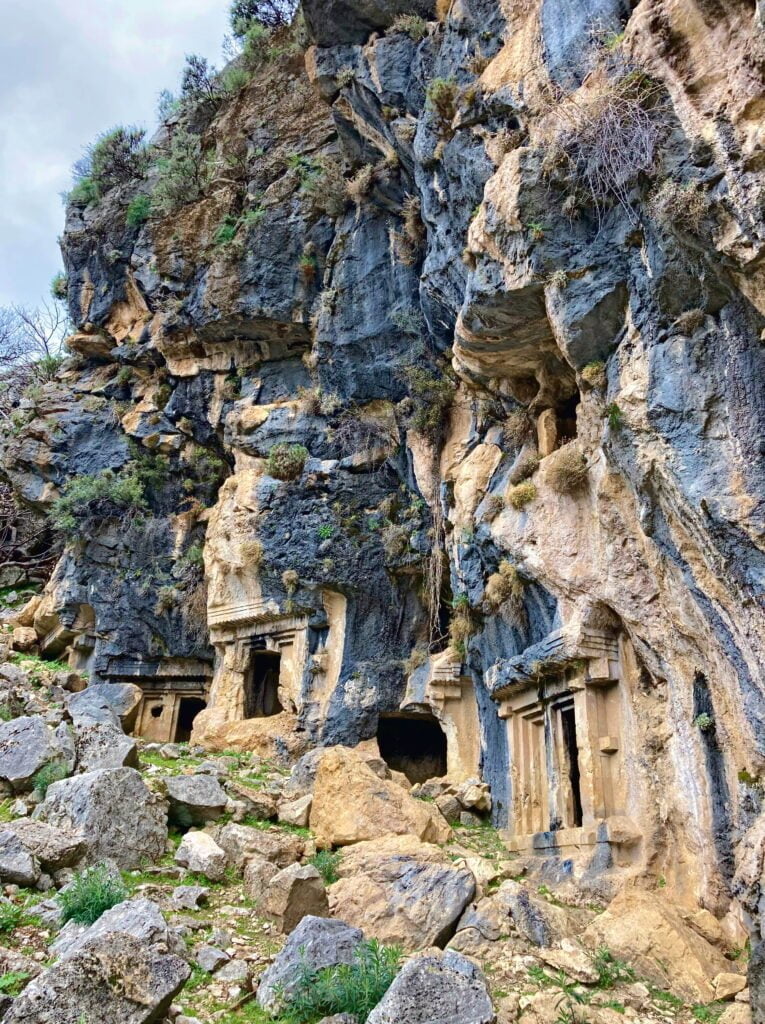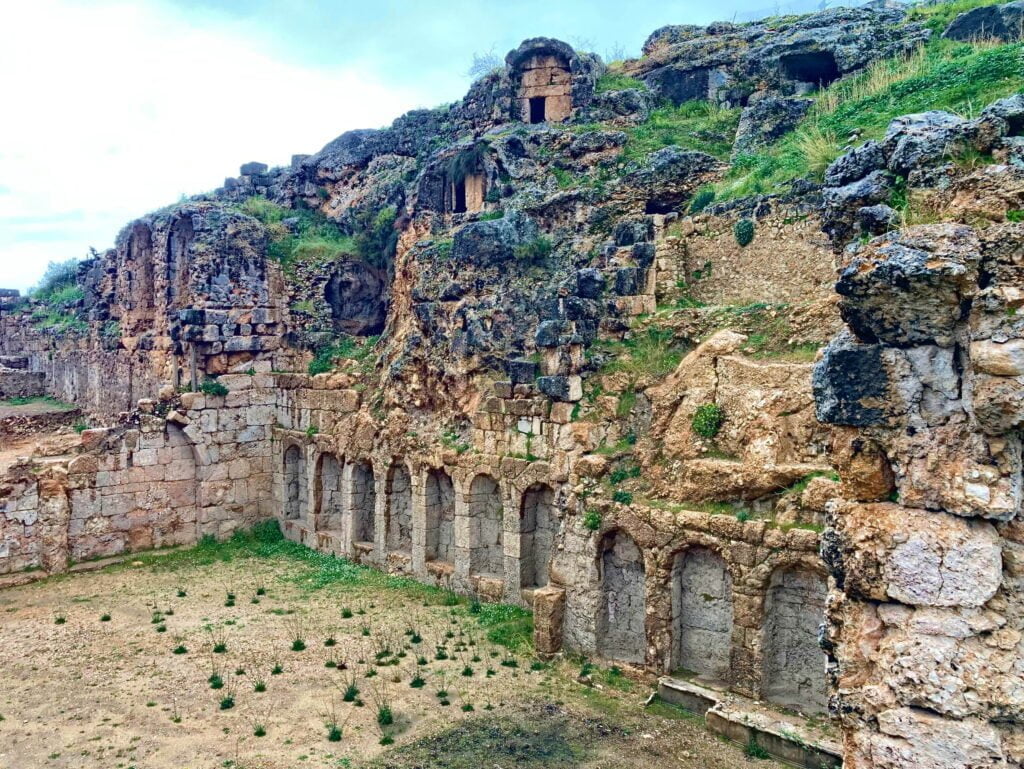 We zijn op weg naar Tlos als we een bruine richtingaanwijzer naar Pinara tegenkomen. We volgen de aanwijzingen en vinden de rotsgraven van Pinara. Wij vinden het erg bijzonder hoe deze graftombes hoog boven ons hoofd in de bergwand zijn uitgehakt.