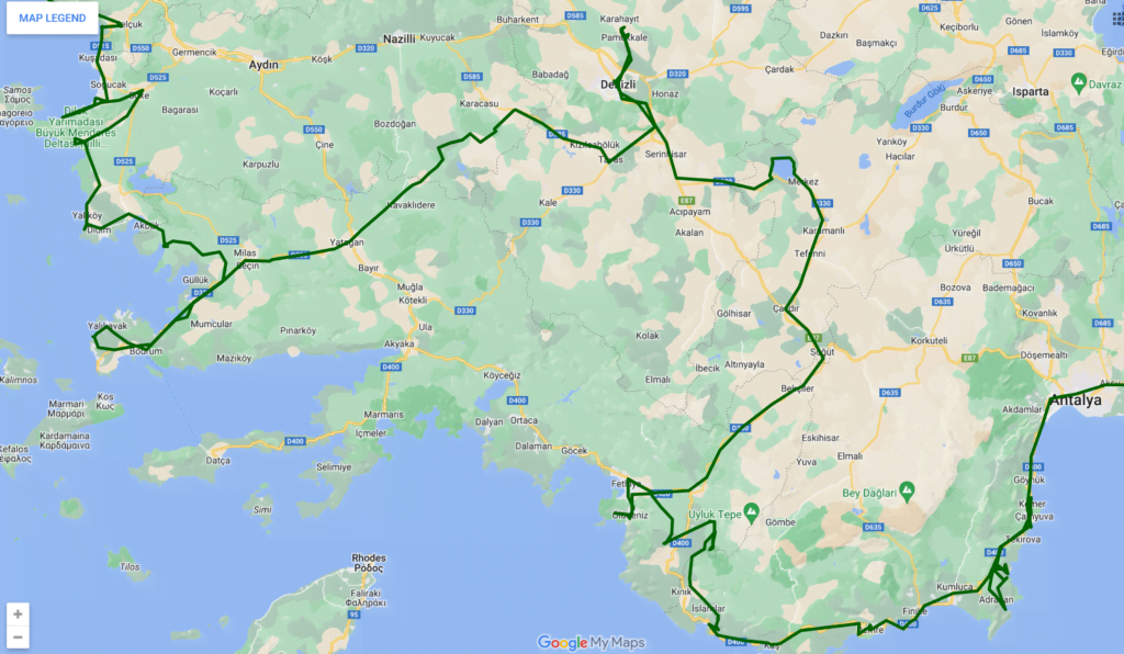 Na onze reis langs de westkust van Turkije, reizen we verder van Bodrum naar Antalya. Daarbij maken we een flinke slinger het binnenland in, naar Pamukkale en dan terug naar de kust bij Öludeniz.