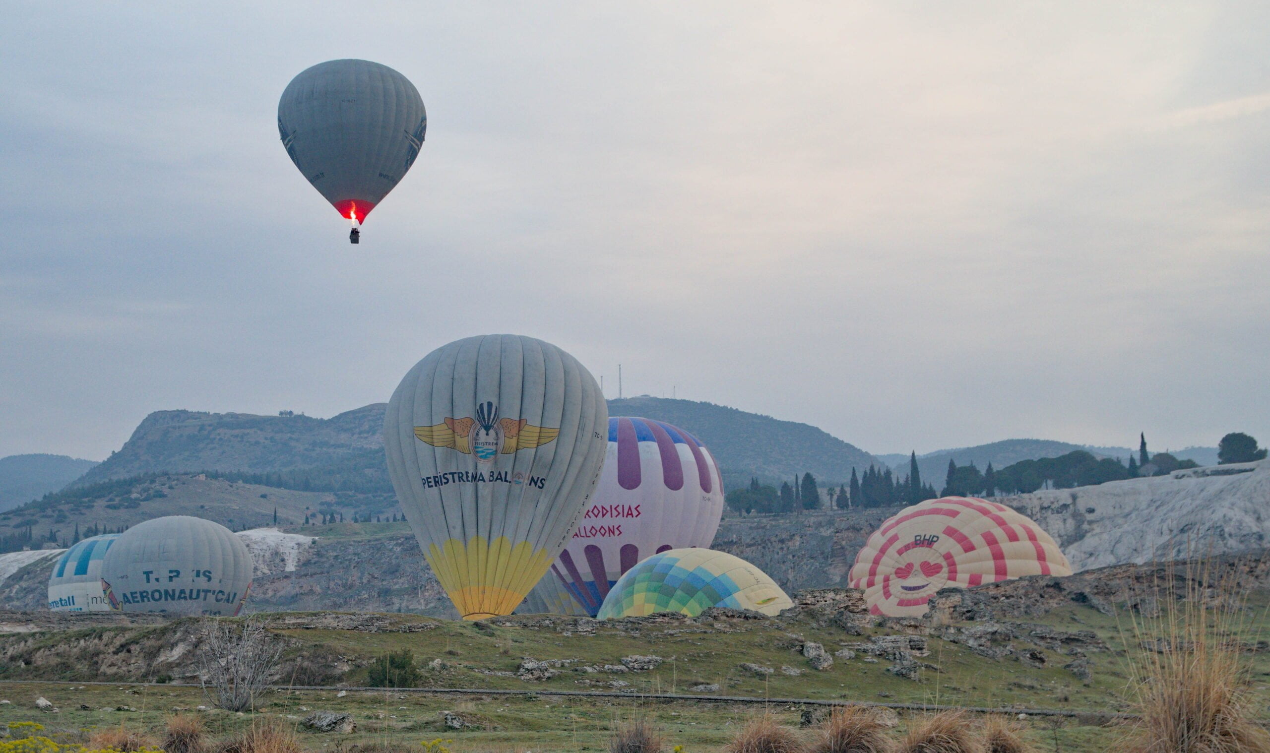 ’s Ochtends worden we wakker op een plekje met uitzicht op de kalkrotsen. Vlakbij ons worden hete luchtballonnen opgelaten, een betoverend gezicht bij het ochtendlicht.