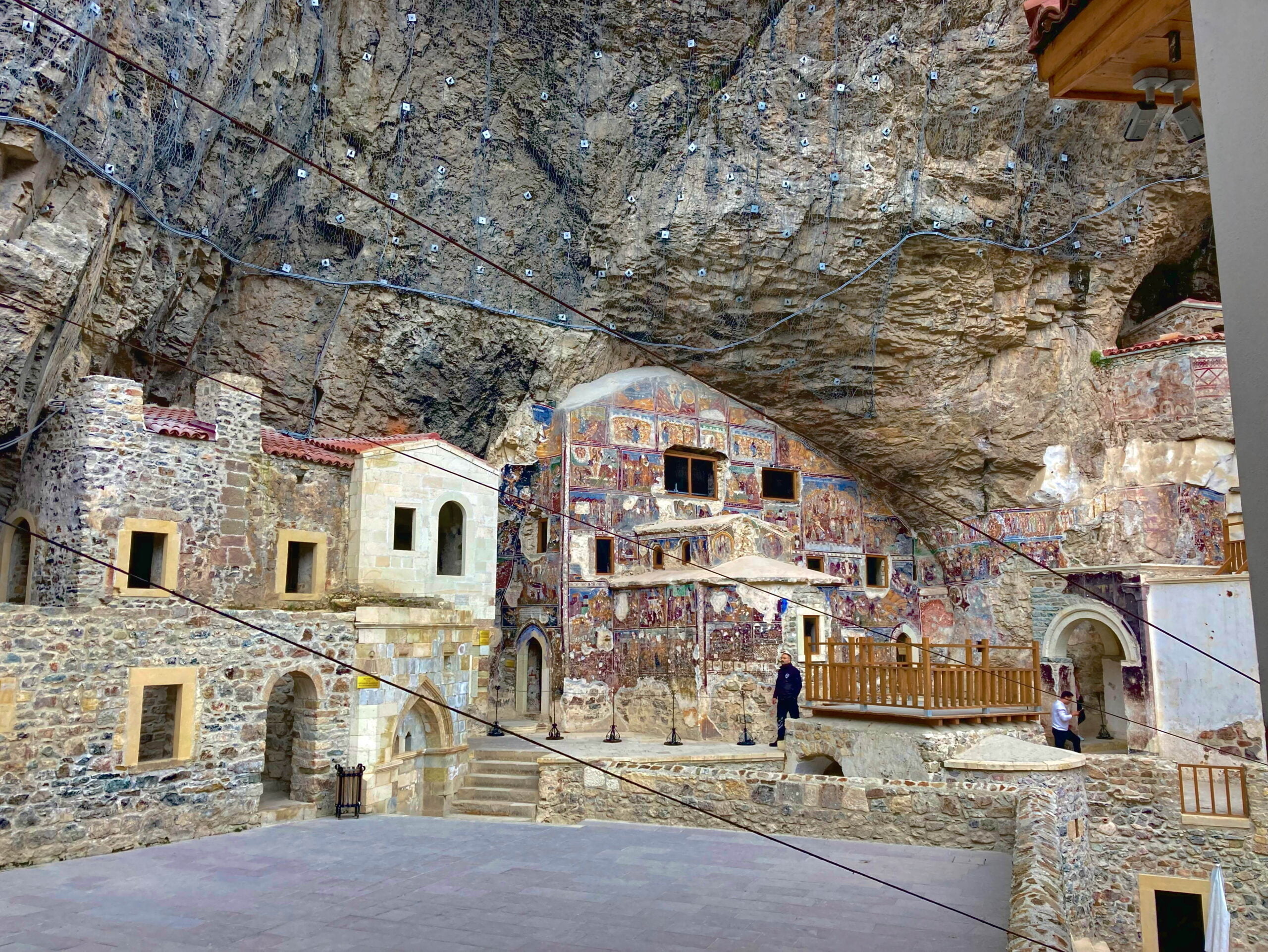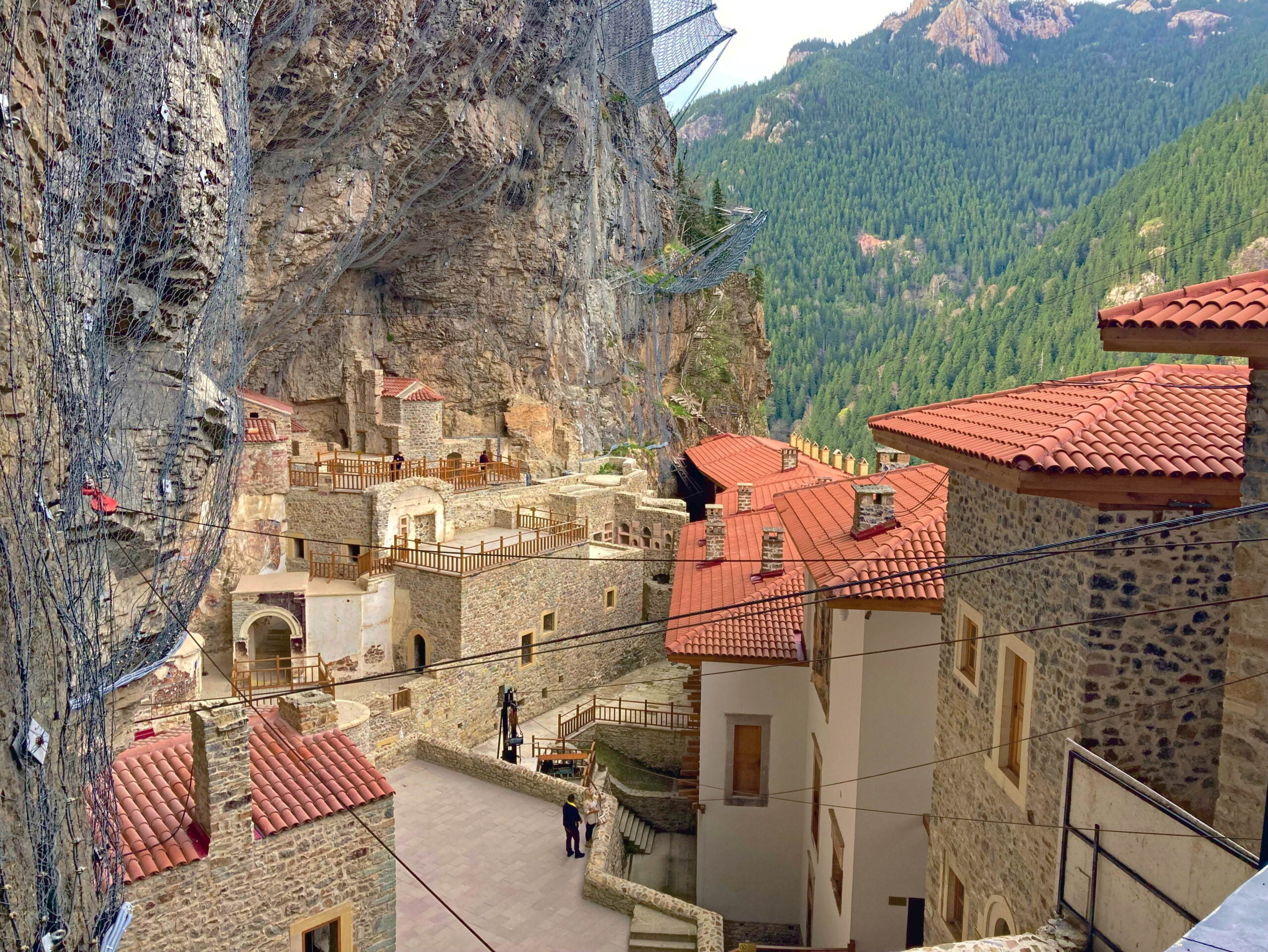 Onze laatste stop in Turkije is het Sümelaklooster. Het klooster is hoog in de rotsen gebouwd en uitgehouwen uit het zandsteen. We komen eind van de middag aan en kunnen het laatste deel van de weg naar het klooster met een busje meerijden, Milady blijft op de parkeerplaats staan.