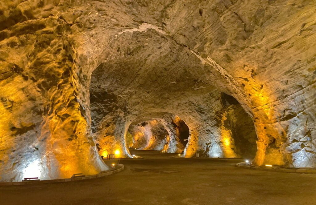 We maken een tussenstop in Tuzluca, een zoutmijn in het oosten van Turkije. Leuk voor een stopover, de parkeerplaats biedt plaats aan meerdere voertuigen en er is een vrij schoon toilet. We lopen door de zoutmijn die sfeervol verlicht is. Het zout levert mooie patronen op de wanden op. Oordeel zelf of je bij je rondreis in Oost-Turkije de omweg de moeite vindt…