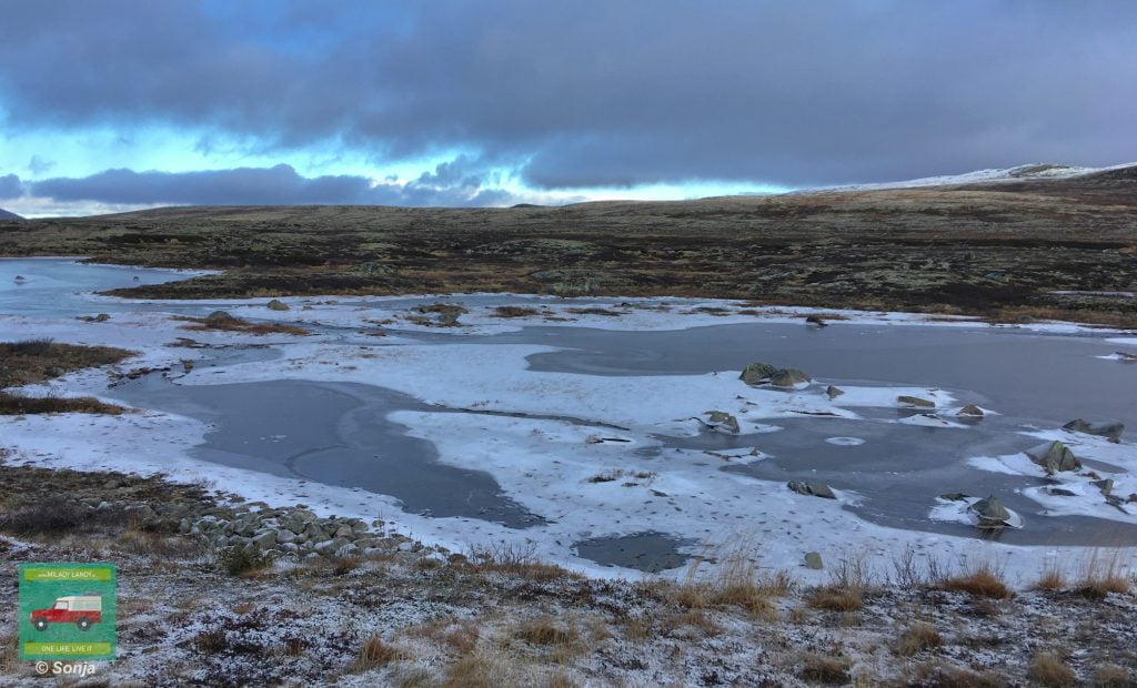We rijden van Oslo naar Bergen, richting de Hardangervidda en er overheen. We zien een uitbundige herfstzon, toch worden de rivieren en meren steeds meer bedekt met ijs. Op de Hardangervidda hoogvlakte worden we verrast met sneeuw en ’s nachts een stevige wind. Dit is het avontuur waar we naar op zoek gaan in Noorwegen, al hadden we het nog niet zo vroeg verwacht. Gelukkig zien we later de zon en een prachtige regenboog.