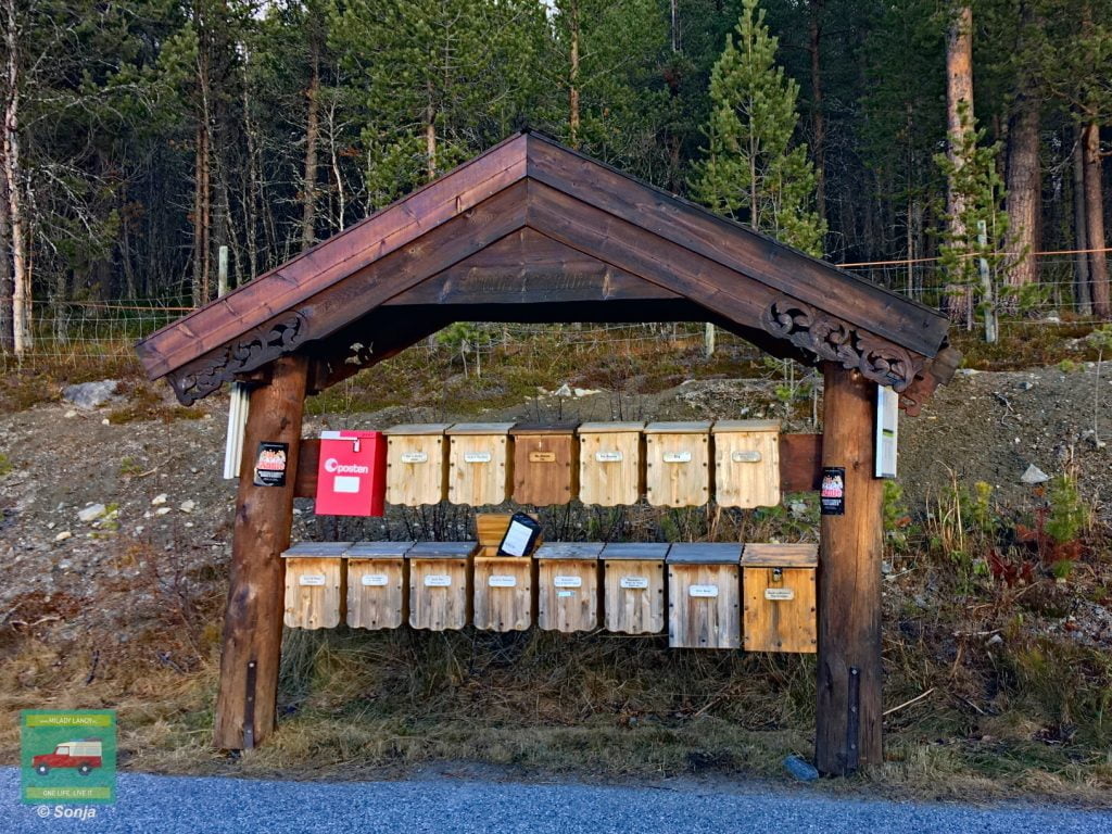 Op het platteland van Noorwegen worden de brievenbussen geclusterd, een mooi gezicht.