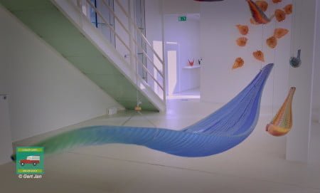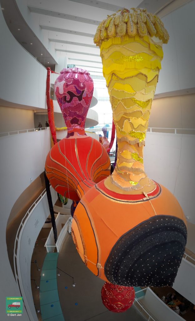 Maar ook dit imposante textiel-kunstwerk komen we steeds weer tegen in de centrale hal en spreekt ons meer en meer aan.