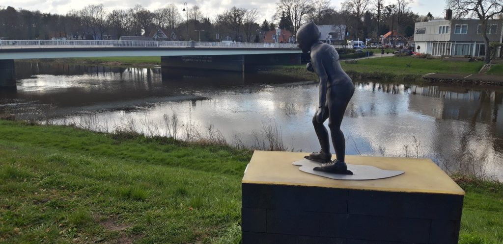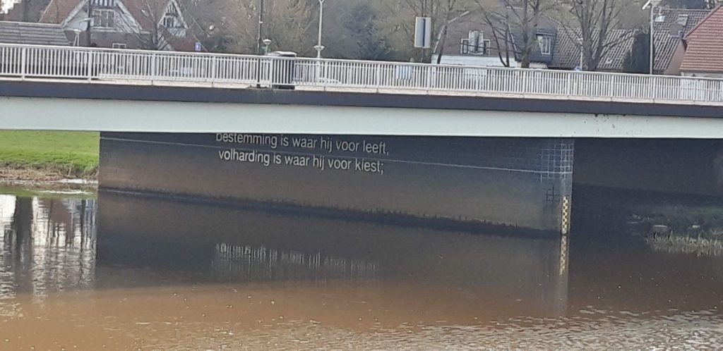 Op de oever van de Vecht staat een beeldje van Reinier Paping, uitkijkend op een mooie spreuk onder de brug.