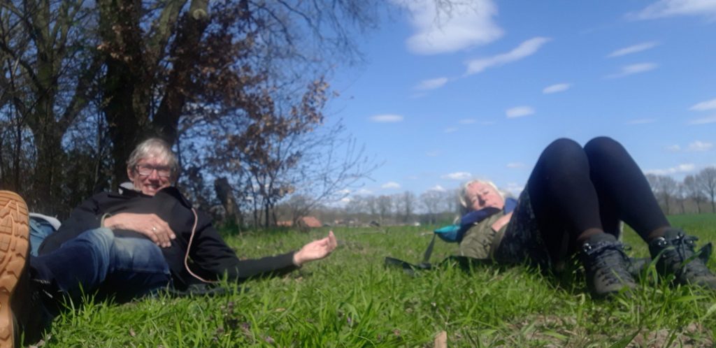 De lunch gebruiken we aan de kant van het pad, zittend op onze regenponcho, lekker in de zon en uit de wind.