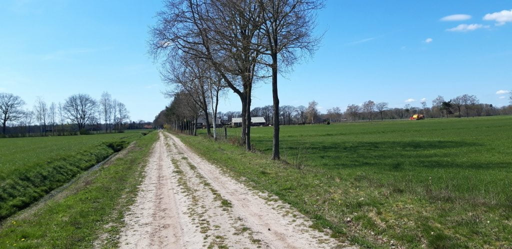 Nog lang horen we het verkeer, maar het landschap van land- en zandwegen met boerderijen zet zich voort aan de zuidzijde van de snelweg.