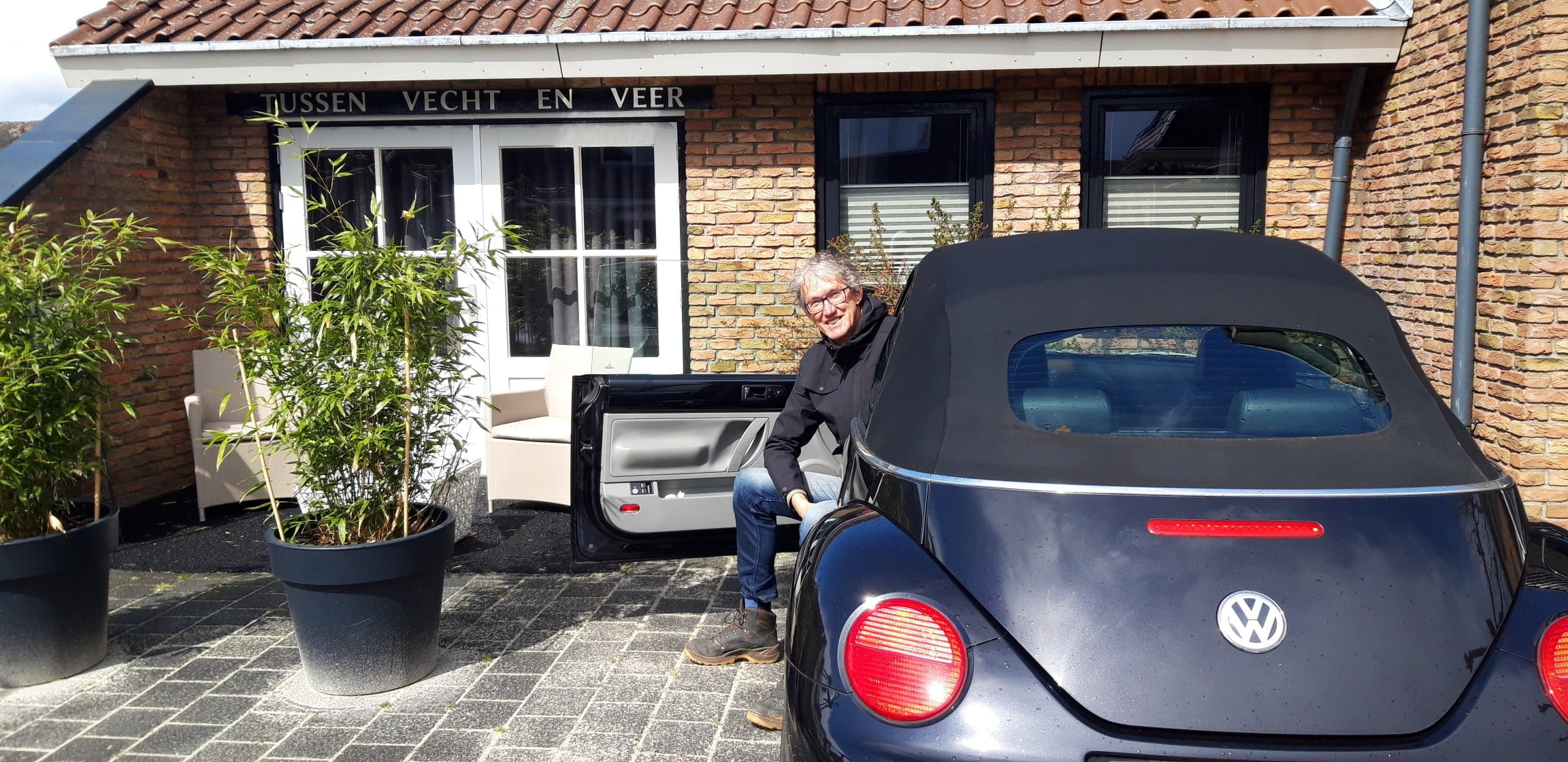 We mogen zelfs de Volkswagen Beetle van Carola lenen om even wat noodzakelijke boodschappen te doen bij Kampeer & Outdoor Reiling Hardenberg.