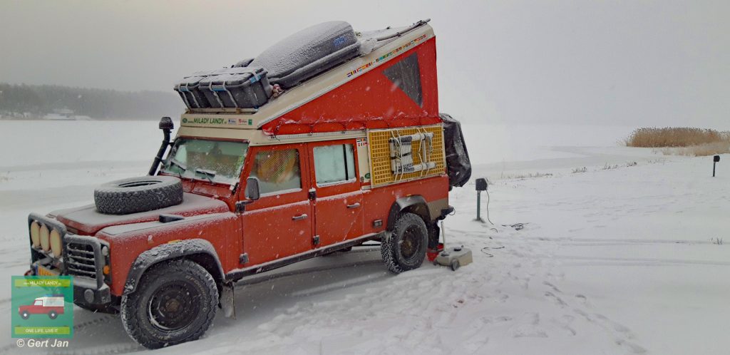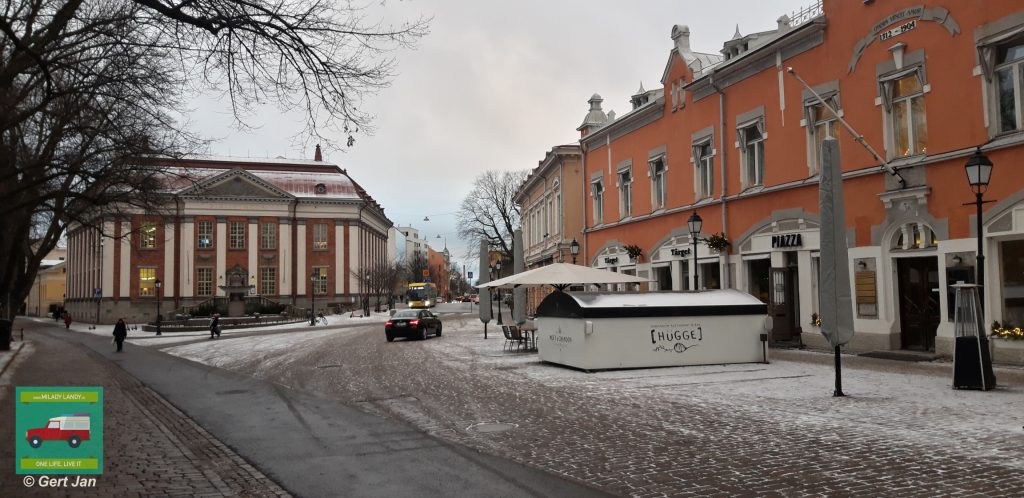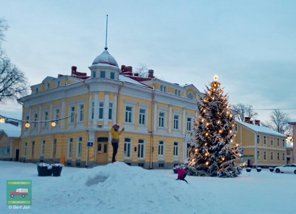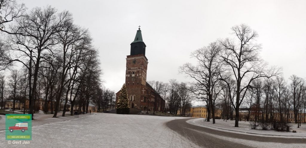 De stad Turku, of Åbo in het Zweeds, is de meest westelijke stad van Finland. We vinden er een parkeerplekje aan de oever van de bevroren rivier. Een voorbijganger spot ons ’s nachts en post deze foto op Facebook met als commentaar: “Is dit de auto van de kerstman?”