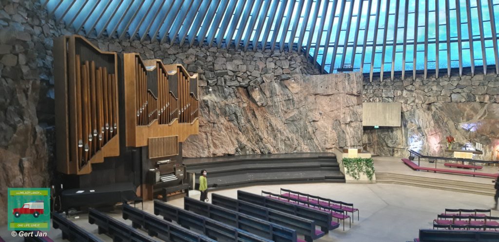 Toch maken deze twee grote kerken niet zoveel indruk op ons als de Temppeliaukio-kerk. Deze kerk is in de jaren 1960 uit de rotsen van de stad gehouwen en biedt nog steeds rust en contemplatie aan de gelovigen en een uitzonderlijke akoestiek voor concerten. Wij zijn vooral onder de indruk van de architectuur, onder andere het koperen dak.