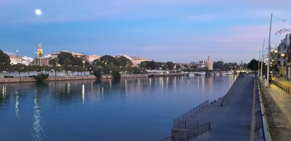 When evening falls we walk along the Guadalquivir, the river that divides the city in two, beautiful with the moon above the old city.