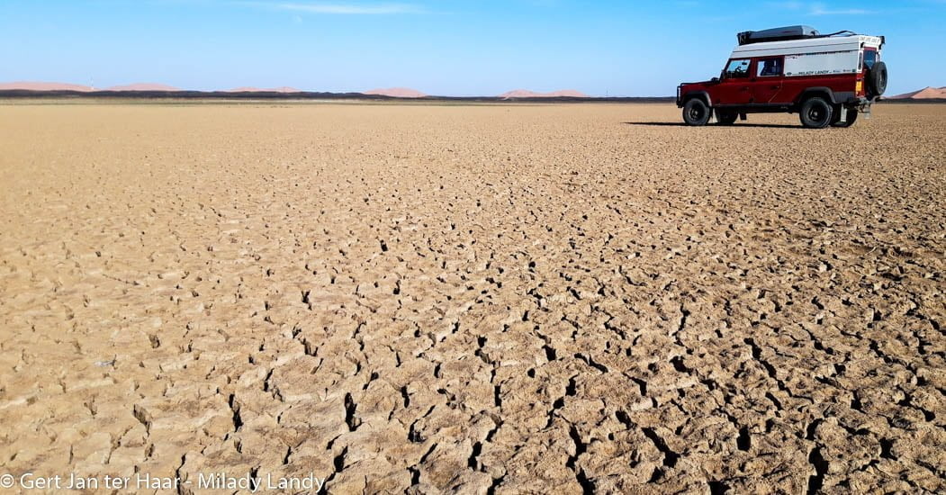 The next day we continue through the desert, alternating stones and sand and sometimes a very loose river bed. Sonja gets confidence in the car and even takes over the steering wheel.
