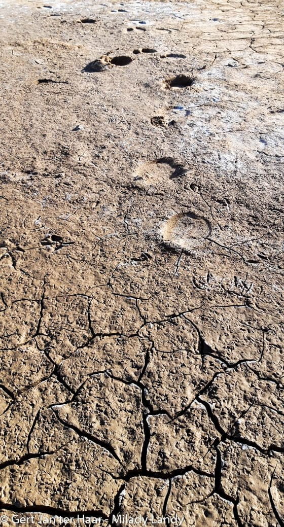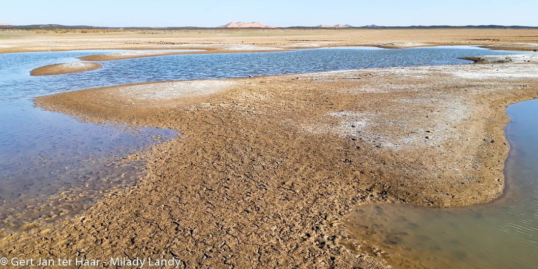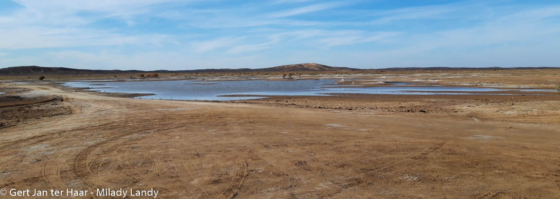 When we have almost given up courage at the end of the afternoon and are on our way back to the campsite, we see a sparkle on the horizon, a fata-morgana? No, it is the last remnant of the lake where 3 flamingos and some geese are looking for cooling and food.