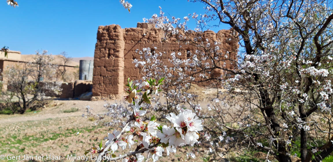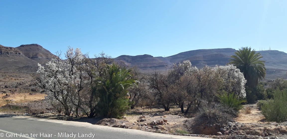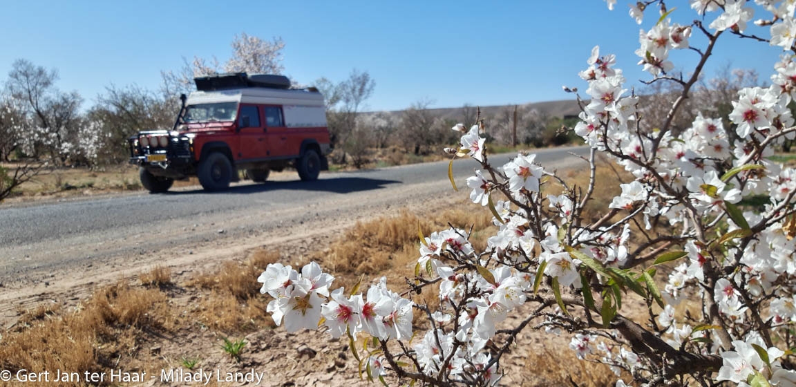 After the wild silence of the desert, we choose to travel to Ouarzazate on the beaten track. Here and there we already see almond trees in bloom.
