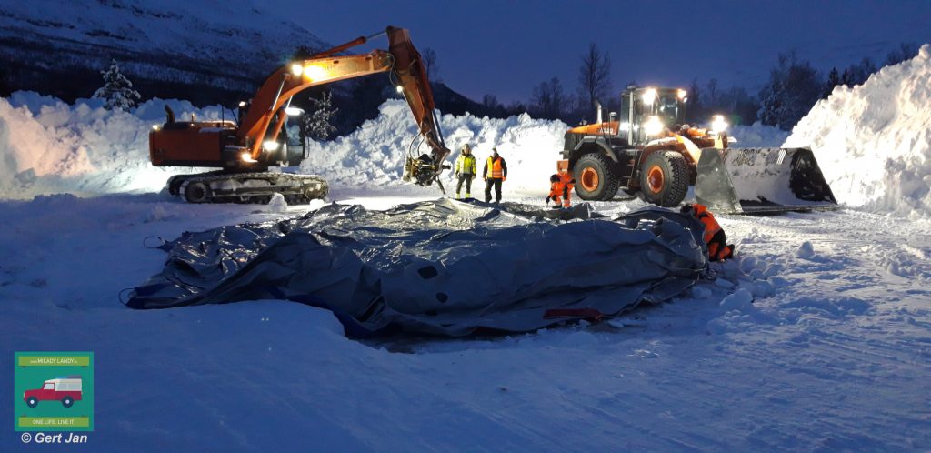 When we are done with the tour of the site, the “balloon”, which will serve as the base for the snow dome, must be put in place. All available hands can be used for this, so I’m happy to lend a hand. It is cold (certainly -15°C), so being physically active is fine.