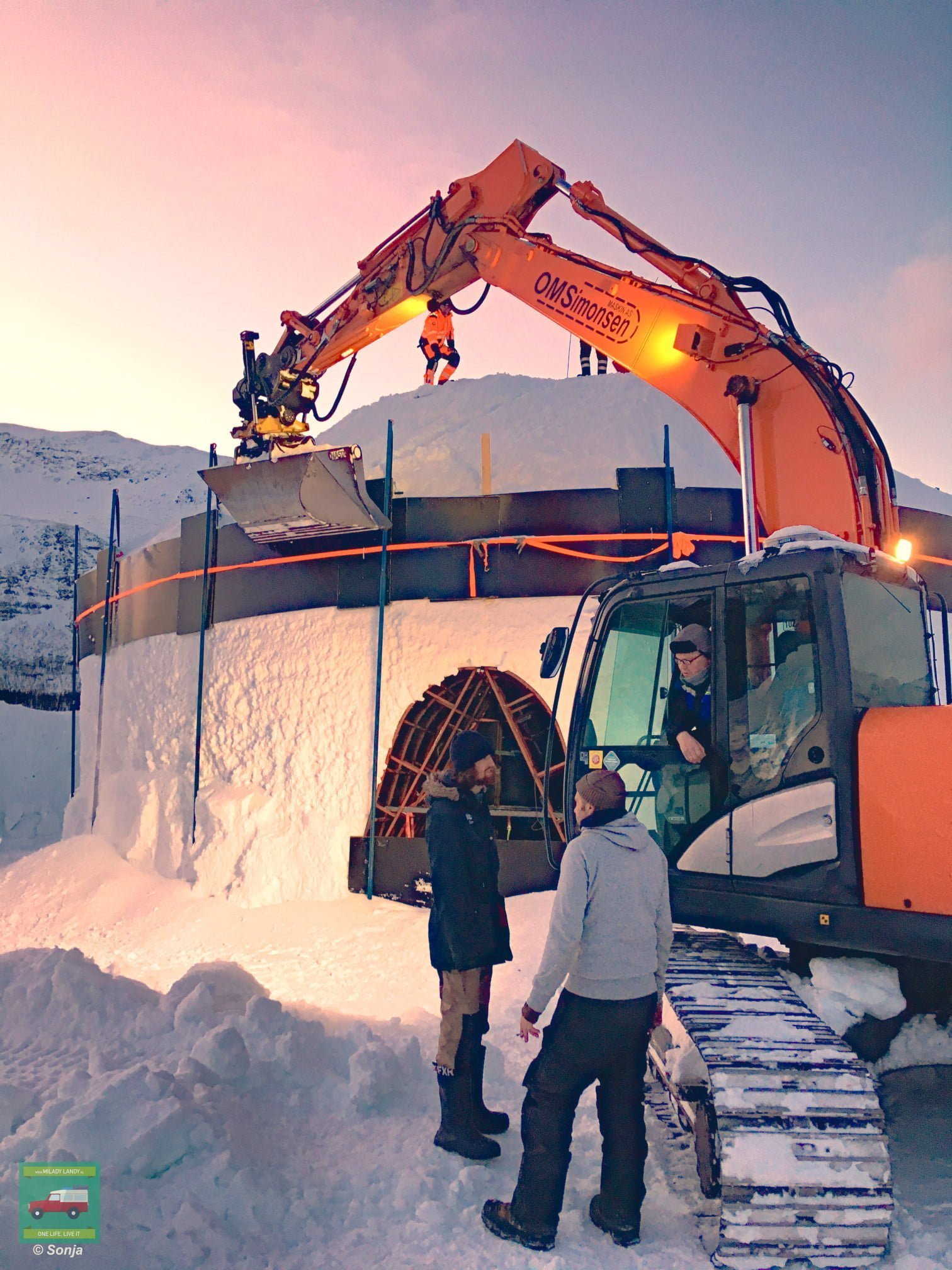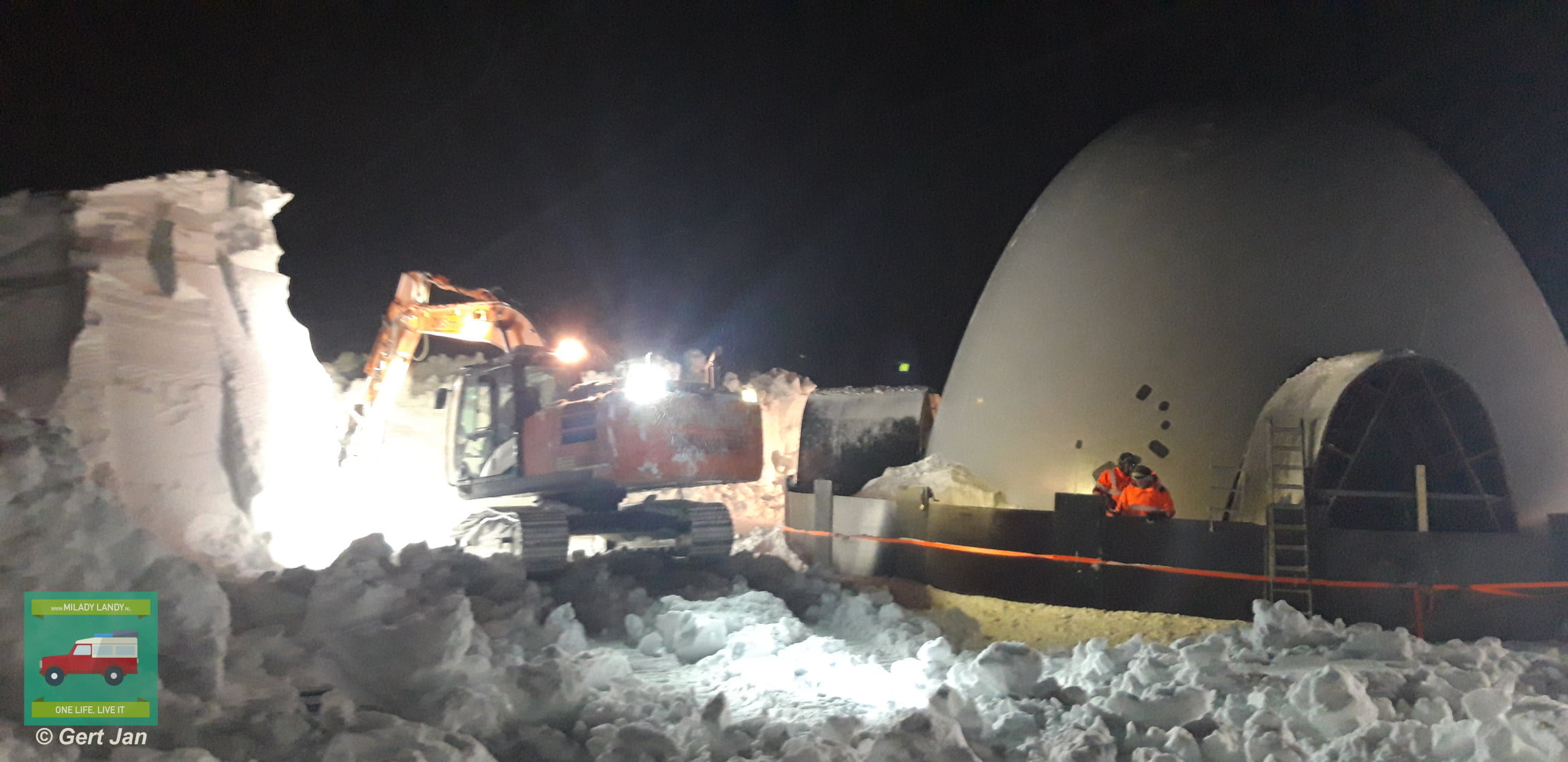 The excavators meanwhile have cleared a spot for the first snow dome and we anchor it in place.