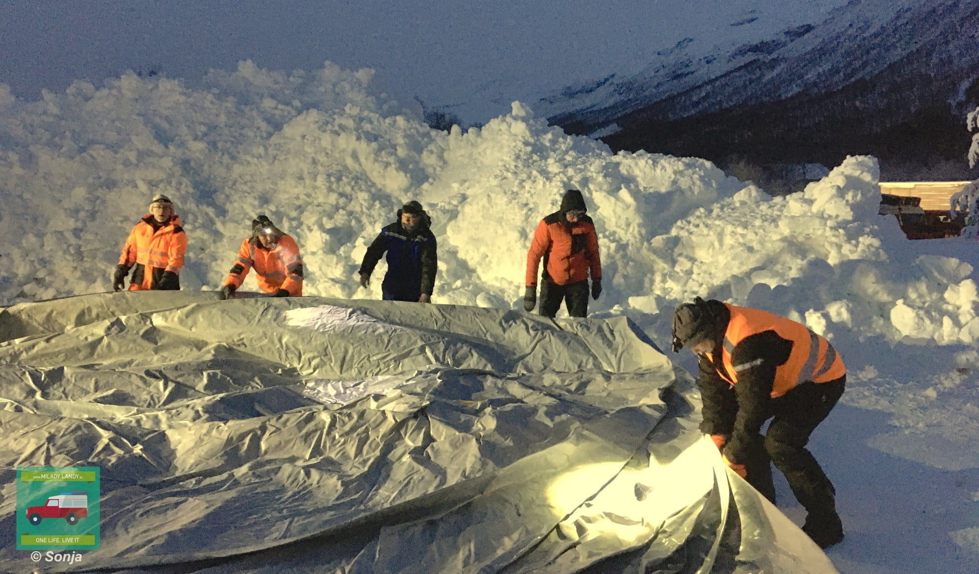 When we are done with the tour of the site, the “balloon”, which will serve as the base for the snow dome, must be put in place. All available hands can be used for this, so I’m happy to lend a hand. It is cold (certainly -15°C), so being physically active is fine.
