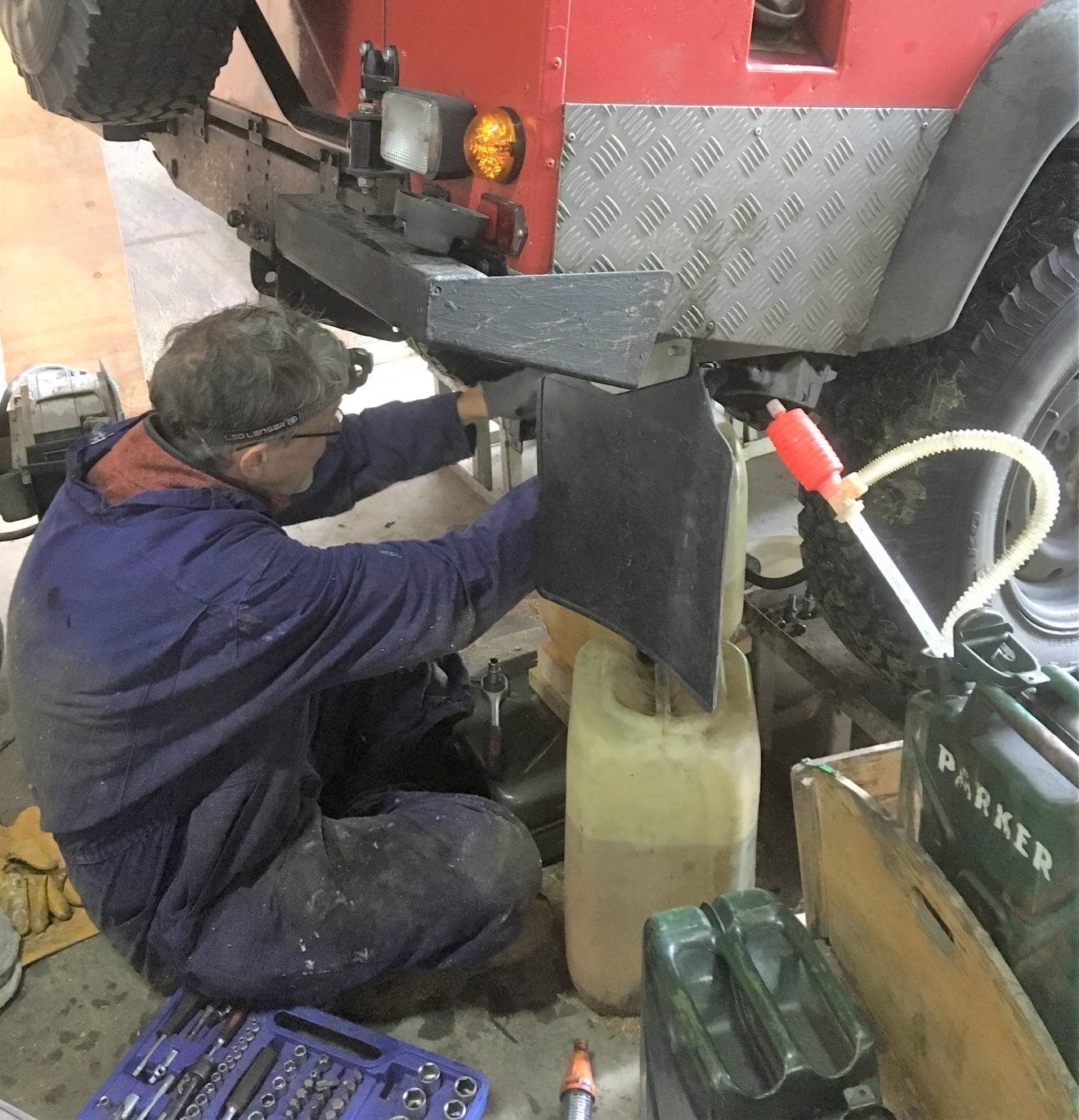 Fortunately we already had the plan to be in Etten-Leur on Wednesday, so I agree with neighbor Arjan to look for the leak with his help. I can stand inside the shed with him and use a few goats to drive the car. The biggest job is to drain all fuel (more than 80 liters) from the tanks. Then the main tank must be removed with all protective cladding. The leak appears to be a gasket of the diesel return on top of the main tank. Extra liquid gasket in between and copper rings under the bolts do wonders.