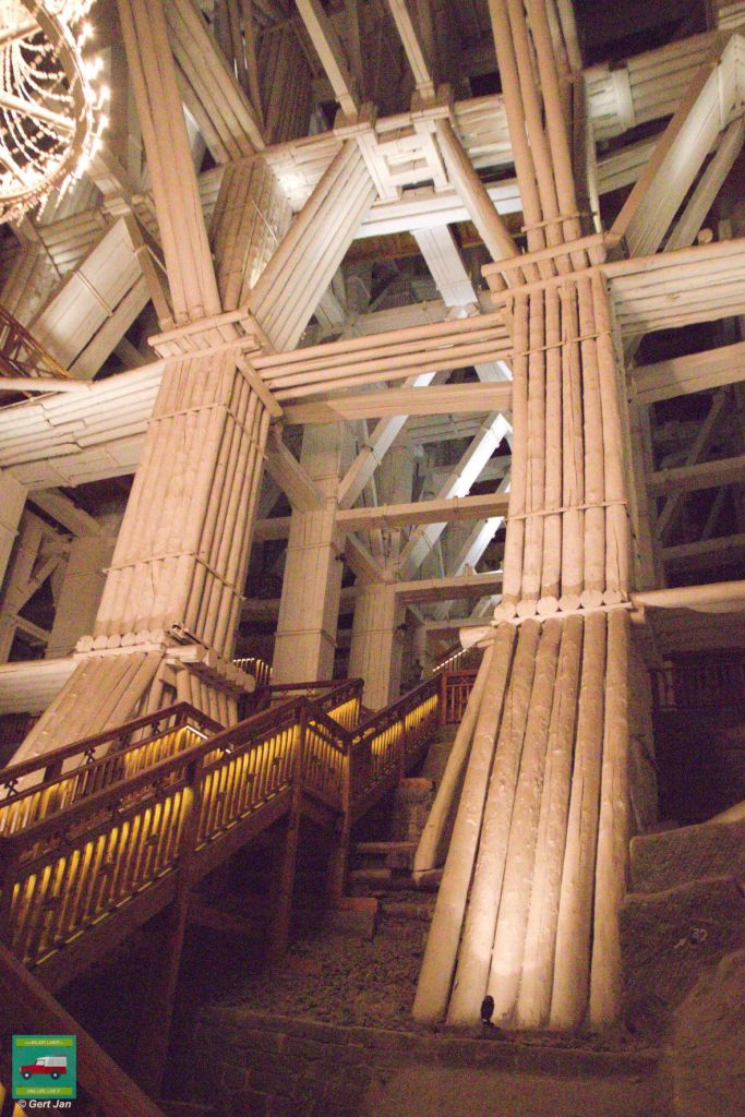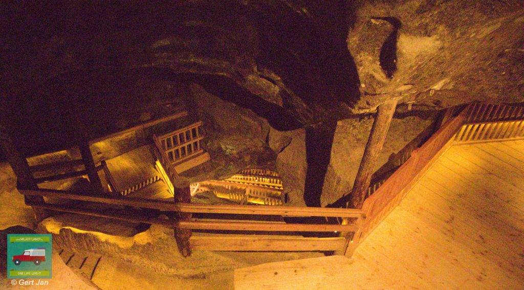 With the guide we descend slowly to the first level of the Wieliczka Salt Mine, for that we have to descend 64 meters along wooden stairs.