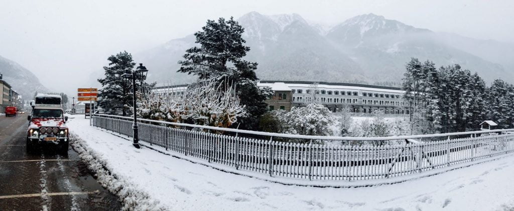 Incidentally, the drive through the Pyrenees was beautiful, through small French villages and along beautiful mountain roads, high over the mighty mountains of this massif. We enter the tunnel of Somport and after a few kilometers we are suddenly in Spain, before the borderpost we already turn towards Canfranc Estacion. We spend the night in a parking lot that is desolated in this season and that is covered with a thin layer of snow here and there .