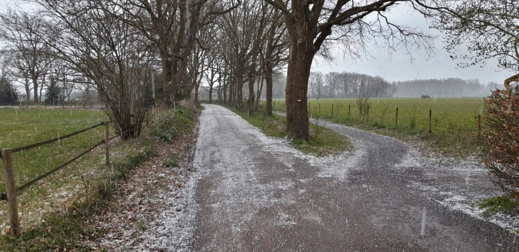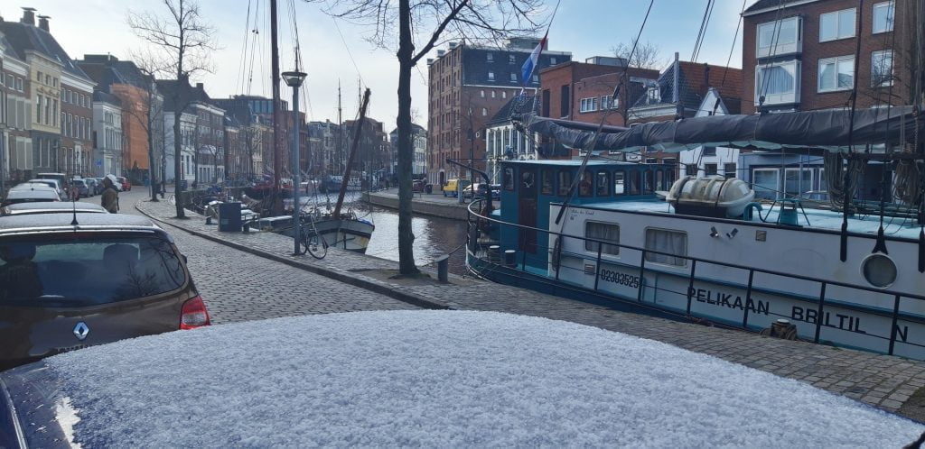Day 3 of the Pieterpad we start in the city of Groningen with a shopping appointment in the Hema, gloves and thinner socks for Gert Jan and a headband for Sonja’s long hair. When we leave there is still snow from last night.