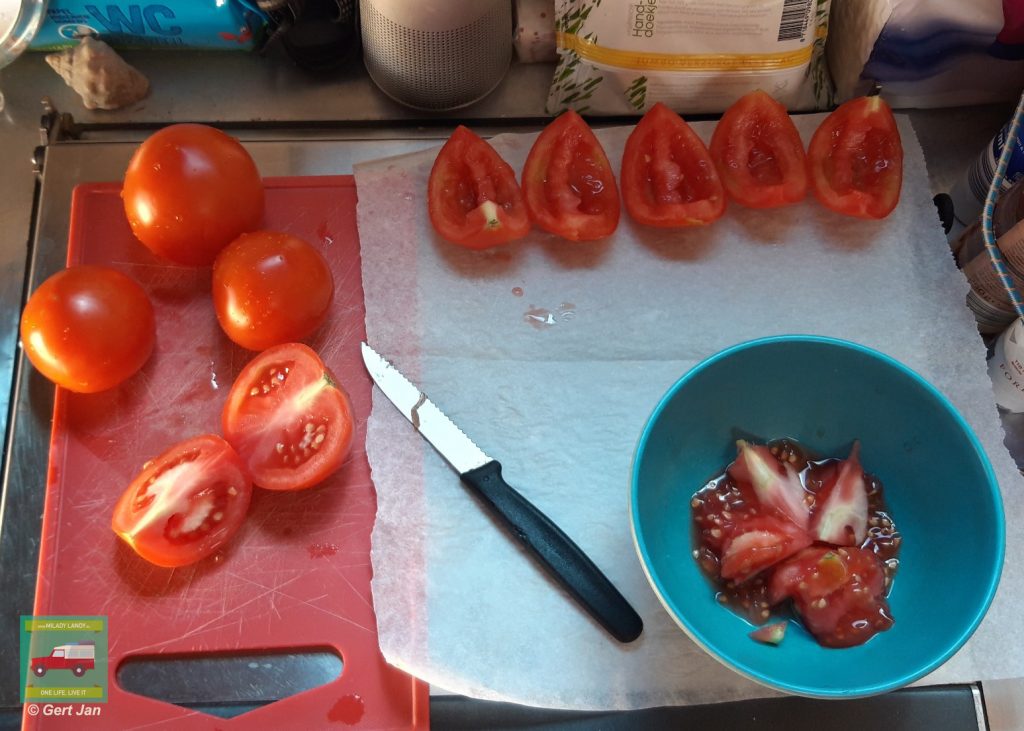 Ondertussen maak ik een bakje klaar om de tomaten in te bewaren als ze voldoende droog zijn.