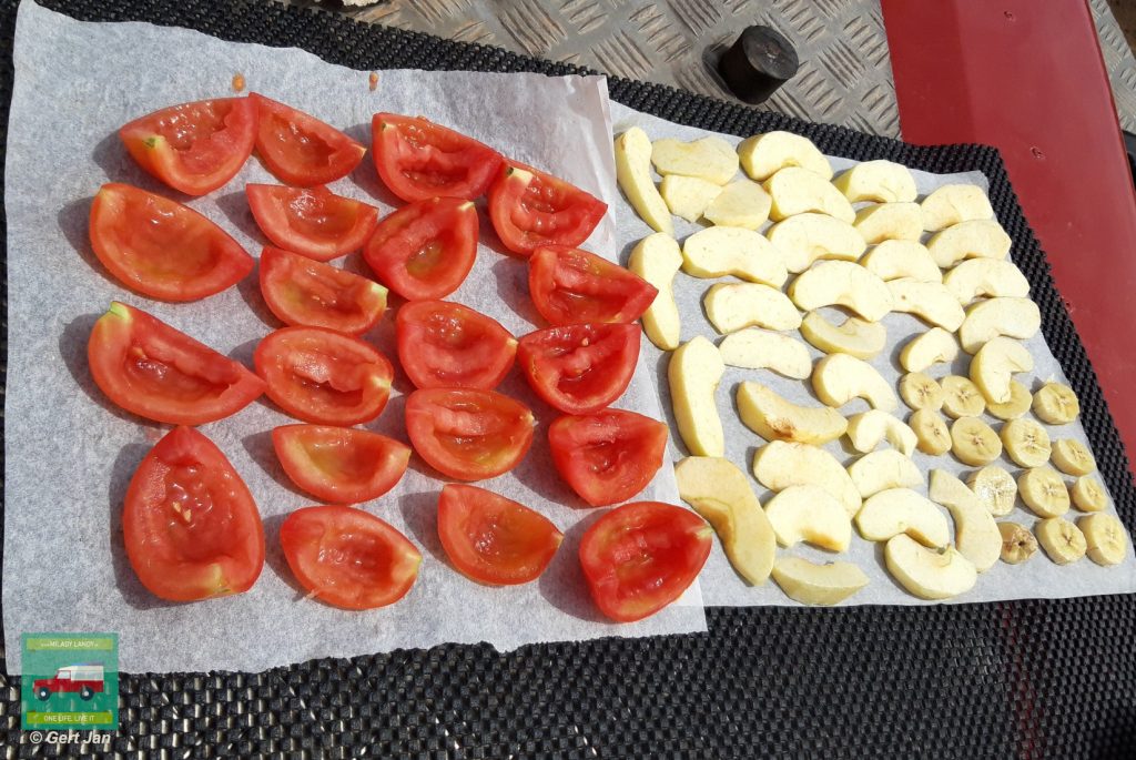 Dat lukte prima, na een dag in de zon, heerlijke gedroogde appel- en bananenschijfjes.