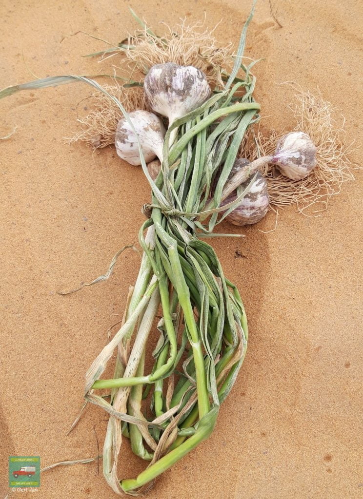de knoflook ligt te drogen in het woestijnzand