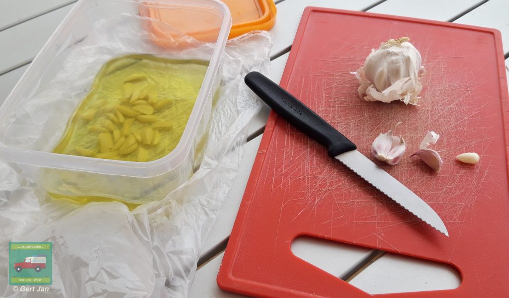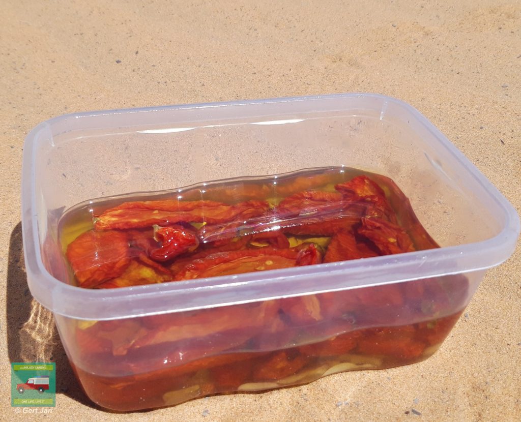 Na het drogen gaan de appeltjes en bananen in een plastic zakje en de tomaten in het bakje met knoflookolie.